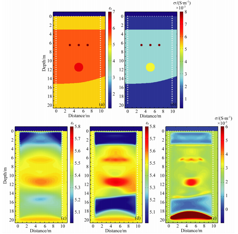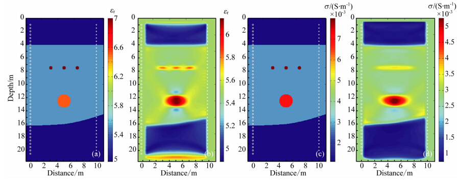 反演结果可以看出电导率对管线和空洞的成像效果要好于介电常数成像.