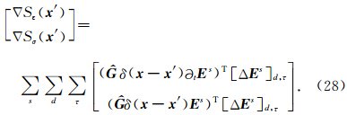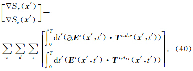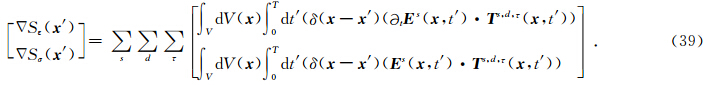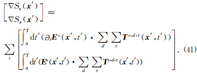 TRs可以解释成在相同介质中后向传播的矢量场.(29)式简单的形式说明梯度是通过将所有源产生的所有时刻及空间三个维度(x,y,z)的场值与“残场源”产生相应时刻与空间场值的内积之和,该内积由前向传播向量场与后向传播残向量场相乘构成.该内积涉及整个时空域的Es、