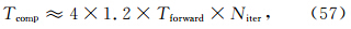 Meles将3×3个正演元胞用一个反演元胞代替(Meles et al., 2010),在反演过程中并没有很明显的减小空间分辨率.本文中,对于不同的模型采用不同的抽稀模式,即对于跨孔测量,因其横向分辨率不如纵向分辨率,可选择在横向每隔2个节点取一个数,在纵向上尽量少抽稀,可以每隔一个节点保留一个电场值,在实际情况中这降低了大概一个量级的内存需求.在计算中应当尽量避免内存交换过程,提高单个机群节点的内存使用,保证计算机的正常运算.由于每个发射点位置的计算相互独立,计算程序可以在分布式计算机群上高效率的计算,该机群可以将每个发射点放置到一个CPU节点的核中.由于分派数据额外的传输时间消耗仅相当于一个正演过程的20%.因此,如果尽量避免数据通讯,完成一个完整的同步反演的计算时间Tcomp表示如下: