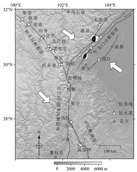 ![]() | 图 1 川西地区跨断层位移场地分布与汶川8.0级、芦山7.0级地震(震源机制解数据来自于哈佛大学CMT,图中大箭头示意块体间的相对运动) Fig. 1 The distribution of fault deformation observation sites and the epicenters of the Wenchuan and the Lushan earthquake(Focal mechanism solutions are from Harvard university CMT, and the big arrows show the relative motion between active tectonic blocks). |