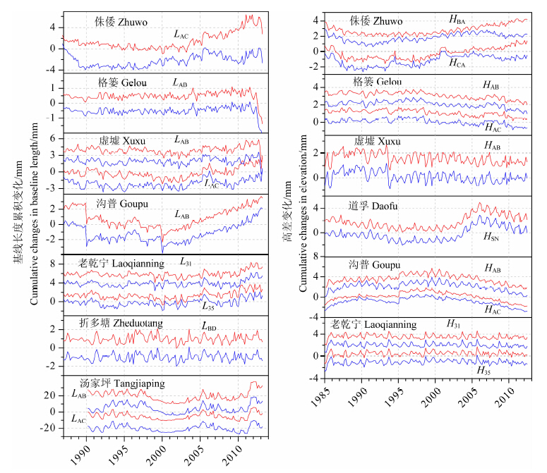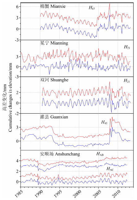 考虑多个场地的构造从属关系,同时也为清晰地展示较多的原始曲线,这里将资料分为三大类,分别为鲜水河断裂带短基线(汤家坪短基线也归入此类),鲜水河断裂带短水准,安宁河—则木河及龙门山断裂带短水准,它们的原始观测曲线分别见图 2、图 3、图 4.