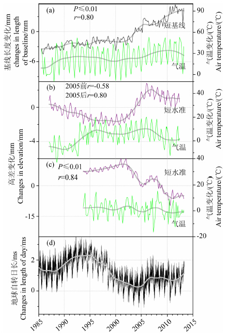 图 11d显示了1980—2013年地球自转日长原始曲线及其趋势线,篇幅所限,这里只给出统计结果.对于鲜水河断裂带的短基线观测,在P≤0.05的显著性水平上,超过50%的测线与地球自转日长变化具有相关关系,相关系数的绝对值在0.213~0.249之间,与1 ms的地球自转速率变化相关的基线长度变化可达0.061~0.143 mm.鲜水河断裂带短水准近50%的测线与日长变化相关,相关系数绝对值介于0.161~0.31,相关的高差变化幅度介于0.029~0.217 mm.安宁河—则木河、龙门山断裂带的短水准70%以上与日长变化相关,相关系数绝对值在0.122~0.475之间,高差变化幅度大部分介于 0.080~0.567 mm(汤家坪影响较大,为2.584 mm). 大部分跨断层测线与日长变化之间为弱-中等强度相关,多数测线在剔除与地球自转速率变化相关的形变成分后,残差的趋势转折仍然存在.由此可以看出,即使假设地球自转日长变化与断层形变之间是因果关系,所能引起的断层形变比重也比较小,因此它们更可能是同一地球物理过程中呈弱相关的两种不同现象.