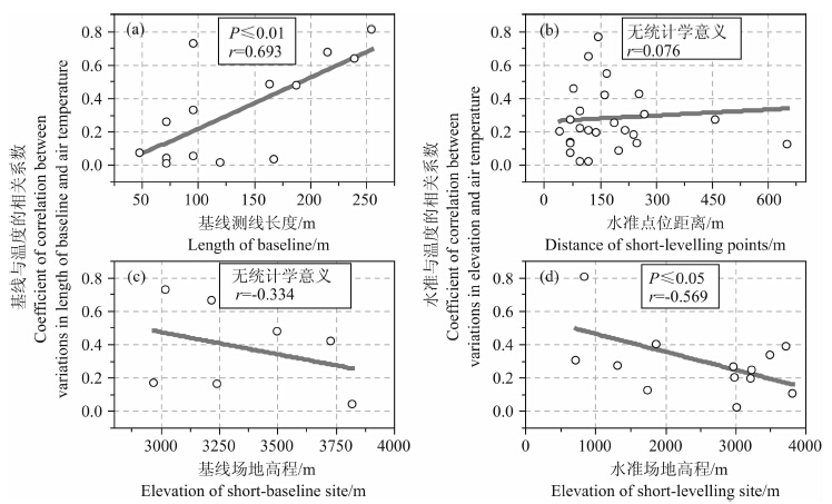 本文的统计结果显示,川西地区大多数跨断层位移观测都受到气温的长期变化影响,并且相关性各异,为探寻这种差异的原因,本文分别考虑了测线长度和场地高程的影响,结果显示,测线长度越长,短基线与气温之间的相关性越强(图 12a);短水准点位距离的影响不显著(图 12b);高程对短基线与气温的相关性影响同样不明显(图 12c),但不排除样本点过少的原因;短水准场地高程越大,短水准与气温的相关性越小,呈负相关关系(图 12d).因此从统计角度讲,短基线与气温之间的相关性,基线长度是影响因素之一,而短水准与气温之间的相关性,高程有一定影响.