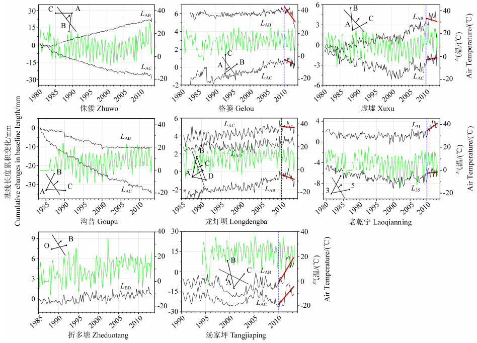 图 2 鲜水河断裂带短基线(细黑)与辅助气温(细绿)原始观测曲线以及2010后的线性趋势(粗红) 短基线曲线向上表示测线伸长,反之缩短,蓝色虚线示意转折时间. 每个子图中给出了测线布设示意图, 大写字母和数字表示点位名称,“LAB”等表示短基线测线名称,下同. Fig. 2 The raw data of short-baseline(thin black),linear fitting results after 2010(thick red), and the temperature(thin green)along the Xianshuihe fault zone For short-baseline data,the curve rise when baseline is exp and ed, and it drop when baseline is contracted. The dash blue lines represent the transition time. In every sub-graph,the capital letters and the numbers represent the names of monitoring point, and the symbols such as “LAB” represent the names of short-baseline and similarly hereinafter. |
