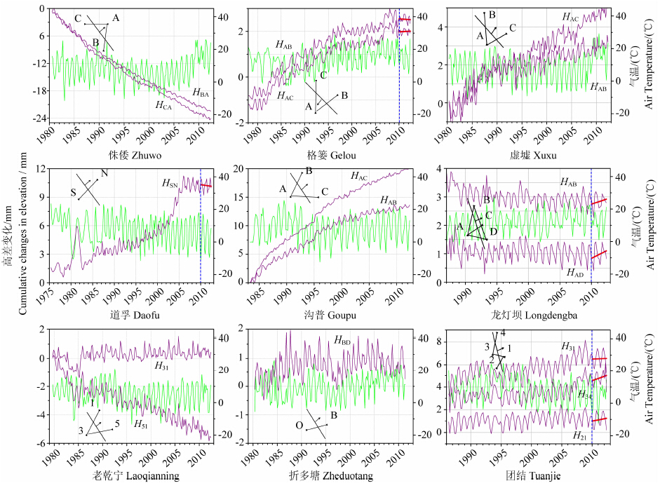鲜水河断裂带短水准观测方面(图 3),直观来看格篓、道孚、龙灯坝、团结场地在2010年前后也近乎同步地发生了趋势转折,并且气温变化也具有相似的变化特点.但总体来讲,短水准观测到的现象不如短基线显著.