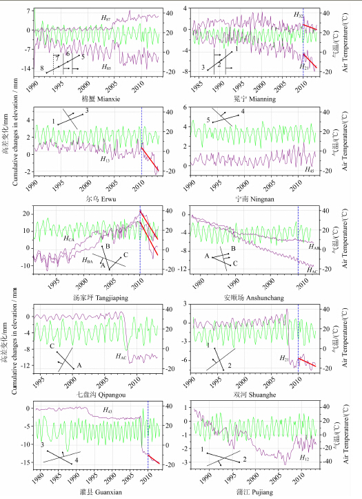 汇总以上结果,2010年前后,研究区内的跨断层位移出现了群体性准同步转折,鲜水河断裂带的左行走滑和张性运动有所减弱,安宁河—则木河、龙门山断裂带的张性运动也开始减弱(或者说压性增强),张压性变得不明显. 7 讨论 7.1 气温对断层位移的影响机理