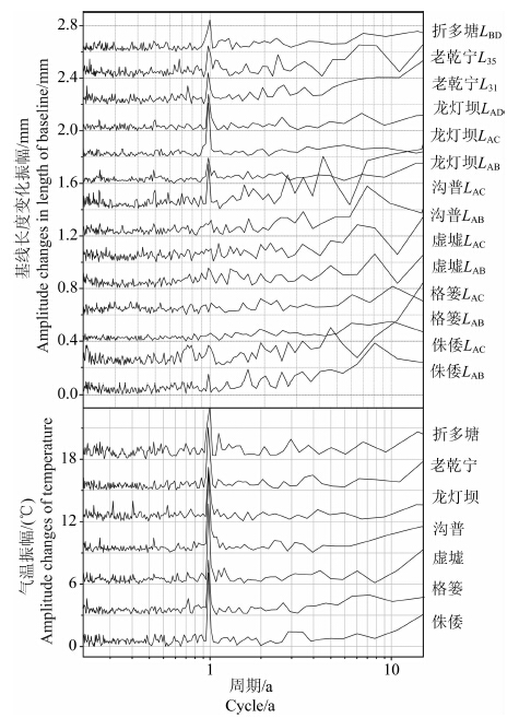 图 5为鲜水河短基线与气温信号的振幅谱,为便于分析,将频率换算成以年为单位的周期.短基线数据中(图 5上图),年变成分较明显,周期小于1a 的信号相对微弱,而周期大于2a的信号幅值比较 显著.气温数据中(图 5下图),年变最为醒目,周期小于1 a的信号较弱,而周期大于2 a的信号幅值也比较突出.由此可见,除了年周期变化(并非本文关 注重点),短基线和气温数据在大于2 a的周期上仍 有较强的信号分布.