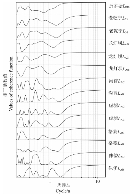 相干函数是描述不同信号之间在频域内相似程度的一种量,图 6为鲜水河短基线与气温数据的相干函数图像,当周期小于2 a时,相干性不高且波动复杂,当周期大于2 a时,相干函数值逐渐增大而趋向于1,表明短基线与气温信号的长周期成分较为相似,频域分布具有较强的相关性.同样,对短水准与气温数据进行频谱分析,也得到极其类似的结果(图略).