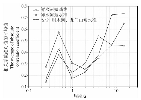 为进一步说明在不同频域(周期)内断层位移与气温之间的相互关联,利用小波变换方法,分别将断层位移和气温数据分解为7个频段(0.16~0.33a、0.33~0.66a、0.66~1.32a、1.32~2.63a、2.63~5.26a、5.26~10.52a、≥10.52a),分频段地统计两者的相关性,之后取相关系数的绝对值,按三大类资料进行平均处理(图 7),结果显示三类资料相关系数的平均值在0.33~0.66a频段内具有局部的极大值,在0.66~2.63a频段较小,而超过2.63 a后,相关性均显著升高,这说明在更长的周期内,跨断层位 移与气温变化仍相关.需要指出,包含年变的0.66~1.32a 频段相关系数较小,是因为断层位移滞后于气温变化而存在相位差,若研究年变与气温之间的相关性需另做相关函数分析.此外,还可发现一个有趣的现象,比较三类资料的相关系数,鲜水河短基线在≥5.26a的频段上较其他两类资料大,而鲜水河短水准在1.32~5.26a频段内最大,安宁河—则木河、龙门山短水准则在≤1.32a的频段内最大,说明 不同地区、不同测项的跨断层位移对气温的响应有所区别.