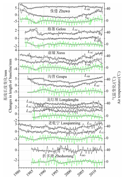对于鲜水河断裂带的短基线观测来讲,其测线长度变化大多具有长周期的趋势变化(图 2).2013年4月20日芦山M7.0地震前2—3 a(大致始于2010年),格篓、虚墟、龙灯坝场地上,多条测线的长度准同步地发生缩短的趋势转折.老乾宁、汤家坪场地上,在同一时间发生了测线伸长的趋势转折,这些变化相对于几十年的活动背景来说很显著.然而,细致观察对应的辅助气温曲线,即使在很强的年变干扰下,依然可以看出气温在同一时间也发生了趋势转折,两者的变化形态显示出一定的相关性,令人怀疑这些转折是否由热形变引起.