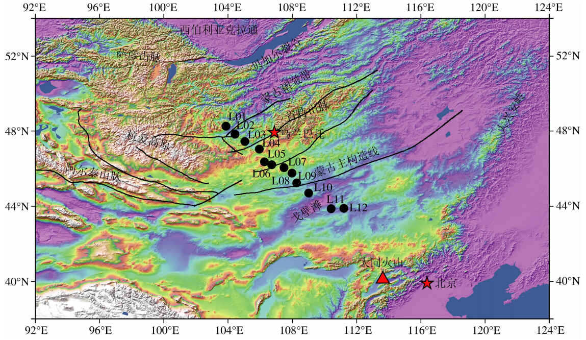 测线西北部的L01台附近不仅有新生代火山岩出露(见图 6),而且地质资料显示有晚古生代二叠纪—三叠纪大陆裂谷火山岩出露(任纪舜等,2002).测线东南部L11、L12号台站位于蒙古主构造线的南部,蒙古主构造线的南部主要是古生代志留纪—泥盆纪和石炭纪岛弧火山岩和火山碎屑岩,并被中生代白垩纪盆地不整合覆盖(Windley et al., 2007; 任纪舜等,2002),且在南部的我国境内有新生代火山岩出露.台站L01、L11和L12的波速比分别为1.78、1.77和1.79,与其他台站相比偏高,可能与其附近观测到的新生代火山活动有关,也可能是晚古生代铁镁质地壳残余的反映.