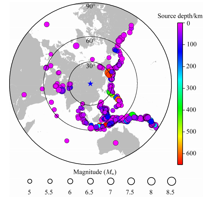 ![]() | 图 2 所用远震事件震中分布Fig. 2 Epicentral distribution of teleseismic events used in this study |