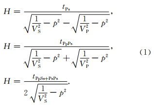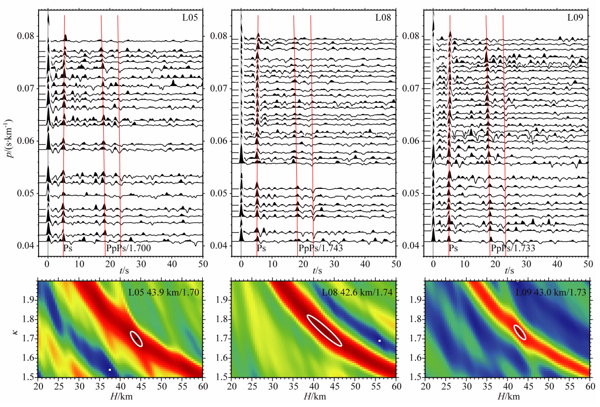 接收函数记录中,紧随直达P波之后的是来源于Moho面的转换震相主要为Ps转换波和PpPs以及PpSs+PsPs地表多次波.利用这些转换震相和地表多次波与直达P波的到时关系即公式(1),可以有效约束Moho界面的深度与地壳平均波速比.其中,H为地壳厚度,VP为P波速度,VS为S波速度,p是射线参数,tPs是Ps震相与P波的到时差,同理tPpPs是PpPs震相与P波的到时差,tPpSs+PsPs是PpSs+PsPs震相与P波的到时差.