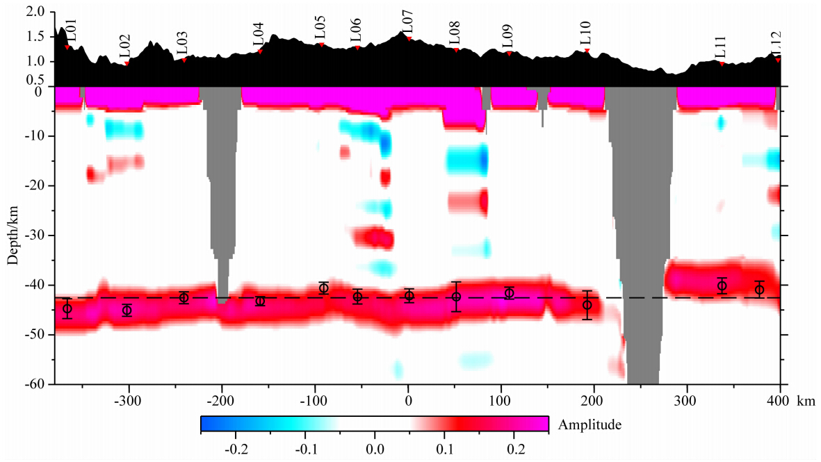 ![]() | 图 5 蒙古中南部地区CCP叠加剖面图图中虚线为42.5 km深度,圆圈为H-κ叠加方法得到的台站下方的Moho深度.Fig. 5 CCP profile of central and southern MongoliaDashed line is the depth of 42.5 km. Circles are Moho depth from the H-κ stacking method. |