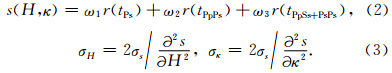 在进行H-κ(κ=VP/VS)叠加时,每个H和κ都 会对应一个到时,根据到时可以获得其在接收函数中对应的振幅,这些振幅按照公式(2)进行叠加,对在一定范围内的H和κ进行扫描,得到最大振幅的位置,即是求得的H和κ值,这种方法便是H-κ叠加.公式(2)中,ω1,ω2,ω3是振幅叠加的加权系数,基于三震相信噪比顺序减小的特点,本文在H-κ叠加时,加权值分别取0.6,0.3和0.1,初始速度模型为IASP91,H和κ的搜索步长分别为0.5 km和0.01.在s(H,κ)取得最大值时,对其进行泰勒展开,略去 高阶项,便得到s(H,κ)的方差(Zhu and Kanamori, 2000),见公式(3).