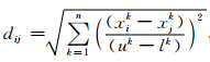 本文将通过引入阀函数自适应调整个体适应值和交叉概率,同时利用模拟退火的方法,对接受概率进行评价.文中引入与个体间距离相关的阀函数对个体适应值和交叉概率进行修正.由于在多参数反演时,参数之间的量级差别很大,所以为了消除量级差异对搜索效率的影响,采用归一化的方式定义个体间距离(方志龙,2012).为此,设 x i、 x j 为两个个体, u =(u1,u2,…,un)和 l =(l1,l2,…,ln)分别表示每个分量的上下界,则个体间的距离可定义为: