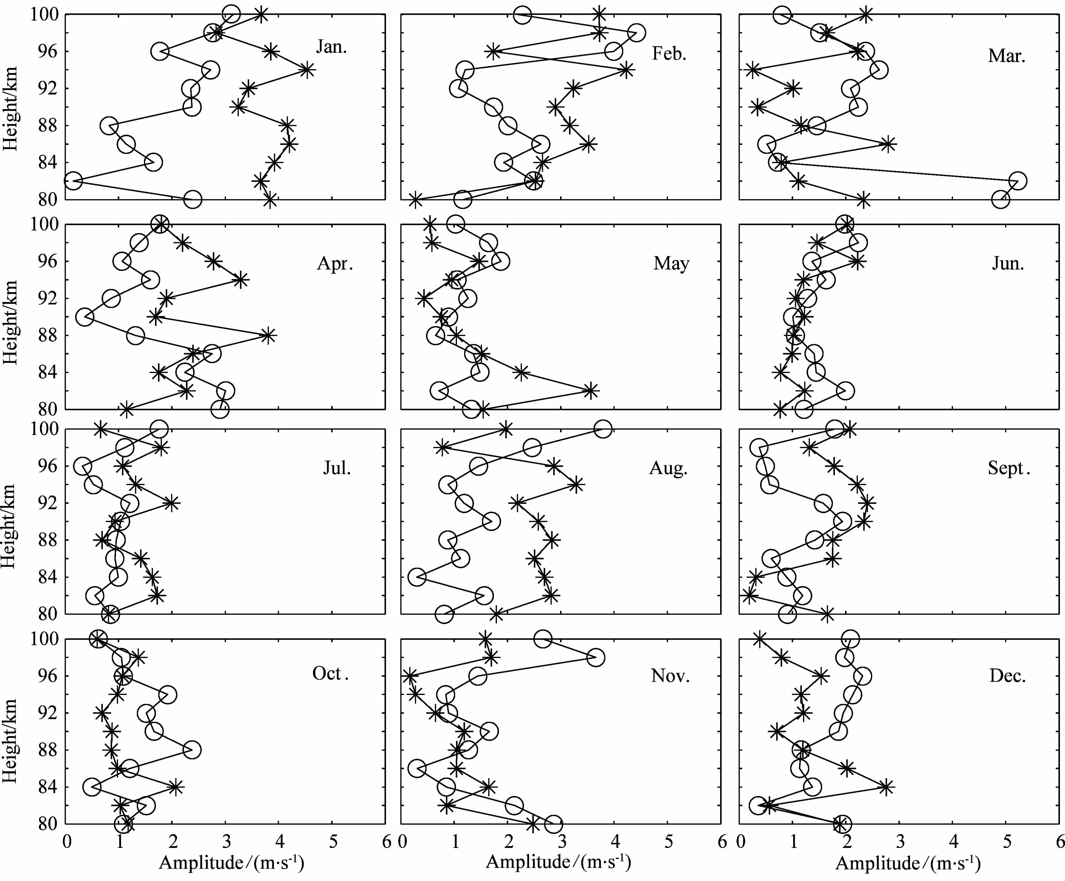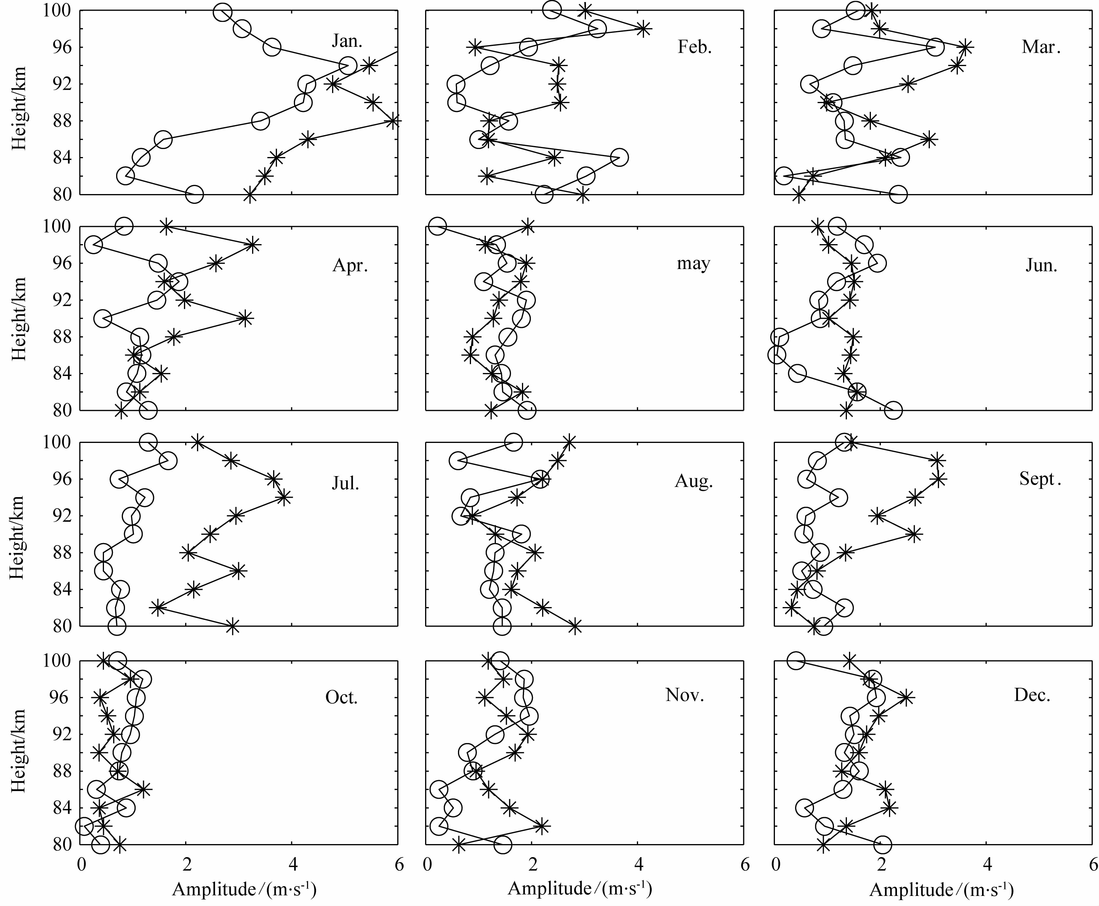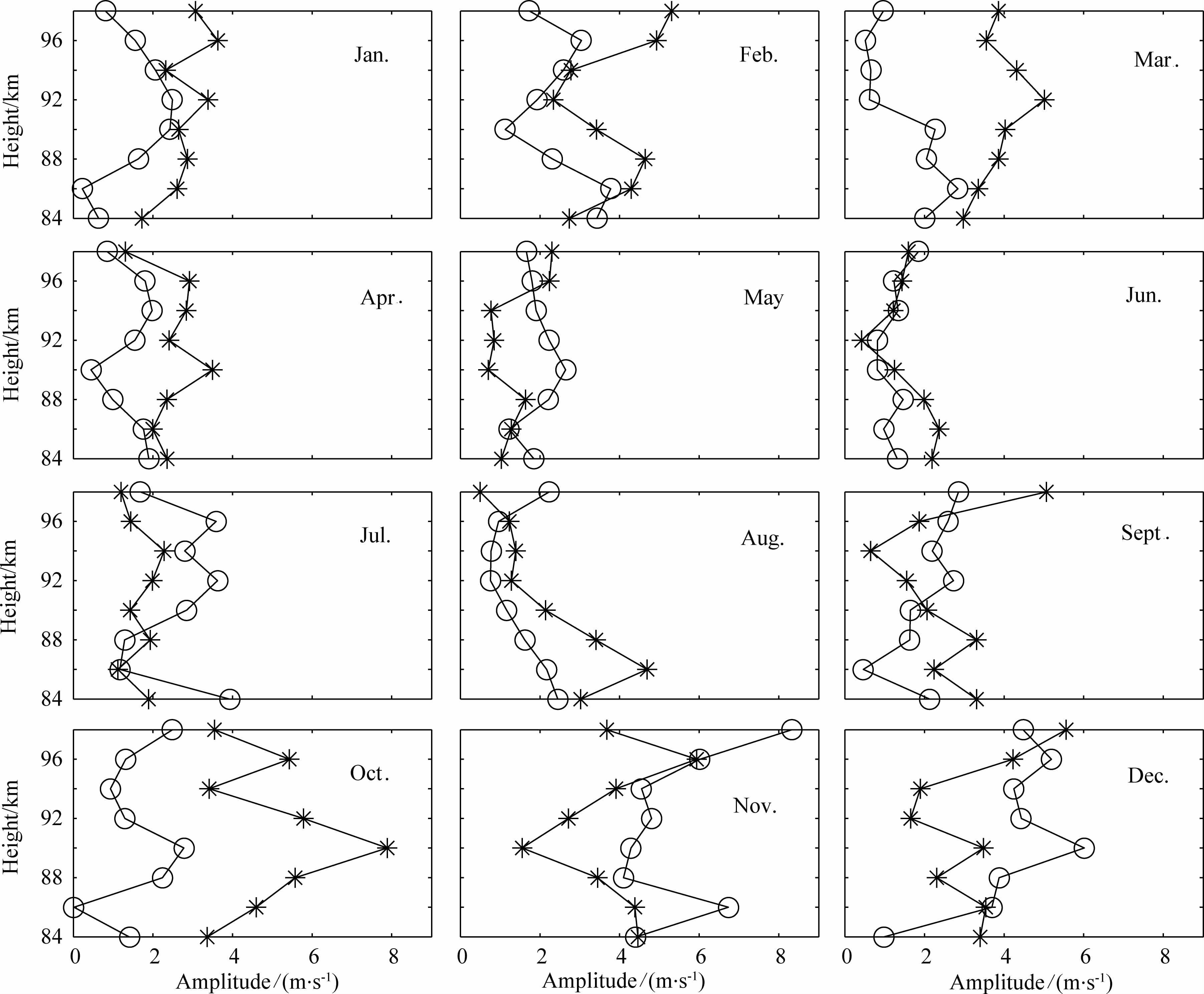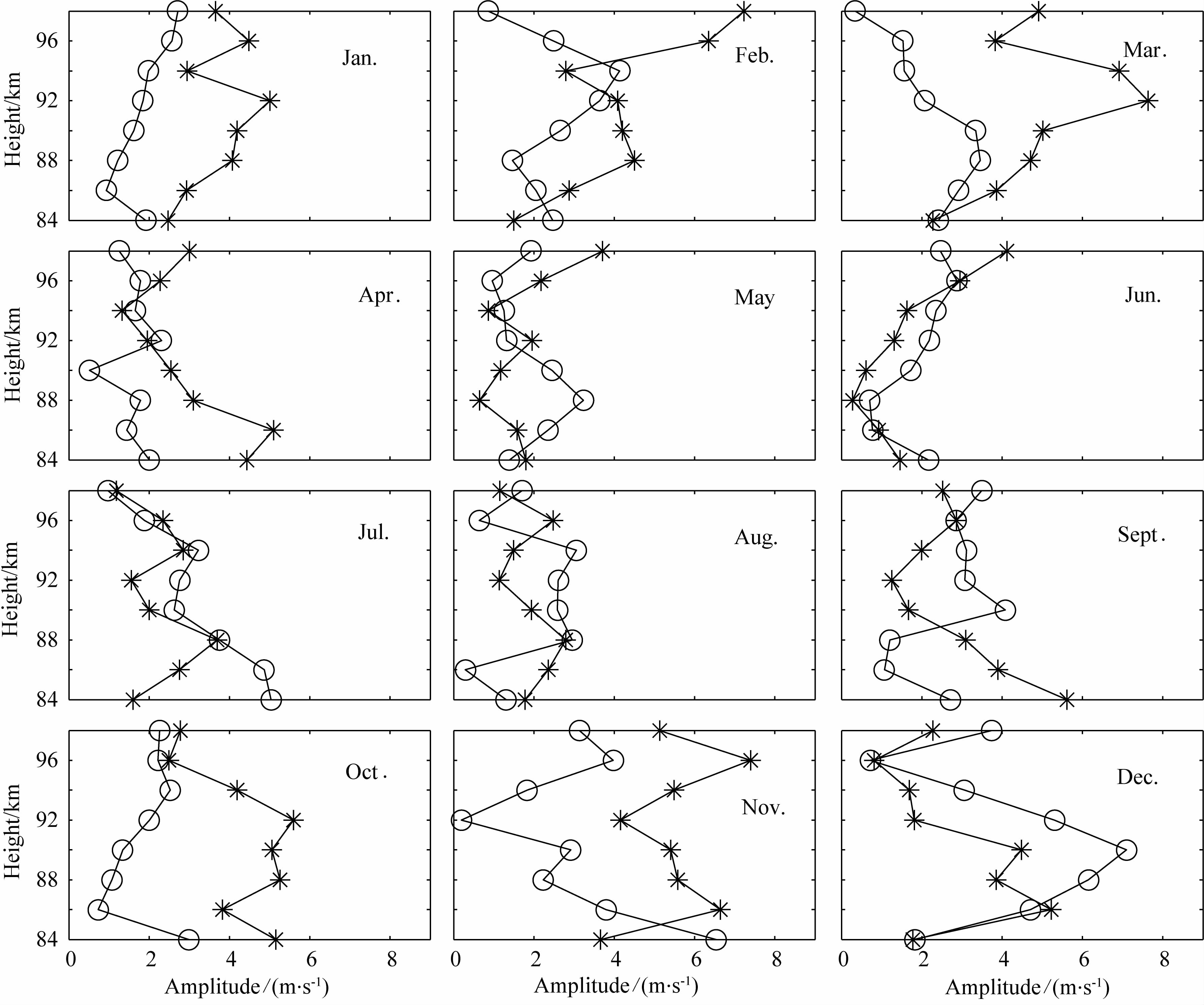 ![]() | 图 3 1—12月份阿德莱德北向太阴M2潮(*线)和N2潮(o线)在84~98 km高度上的幅度 Fig. 3 The amplitudes of the northward M2(* line) and N2(o line)lunar tide in Adelaide from January to December at 84~98 km heights |