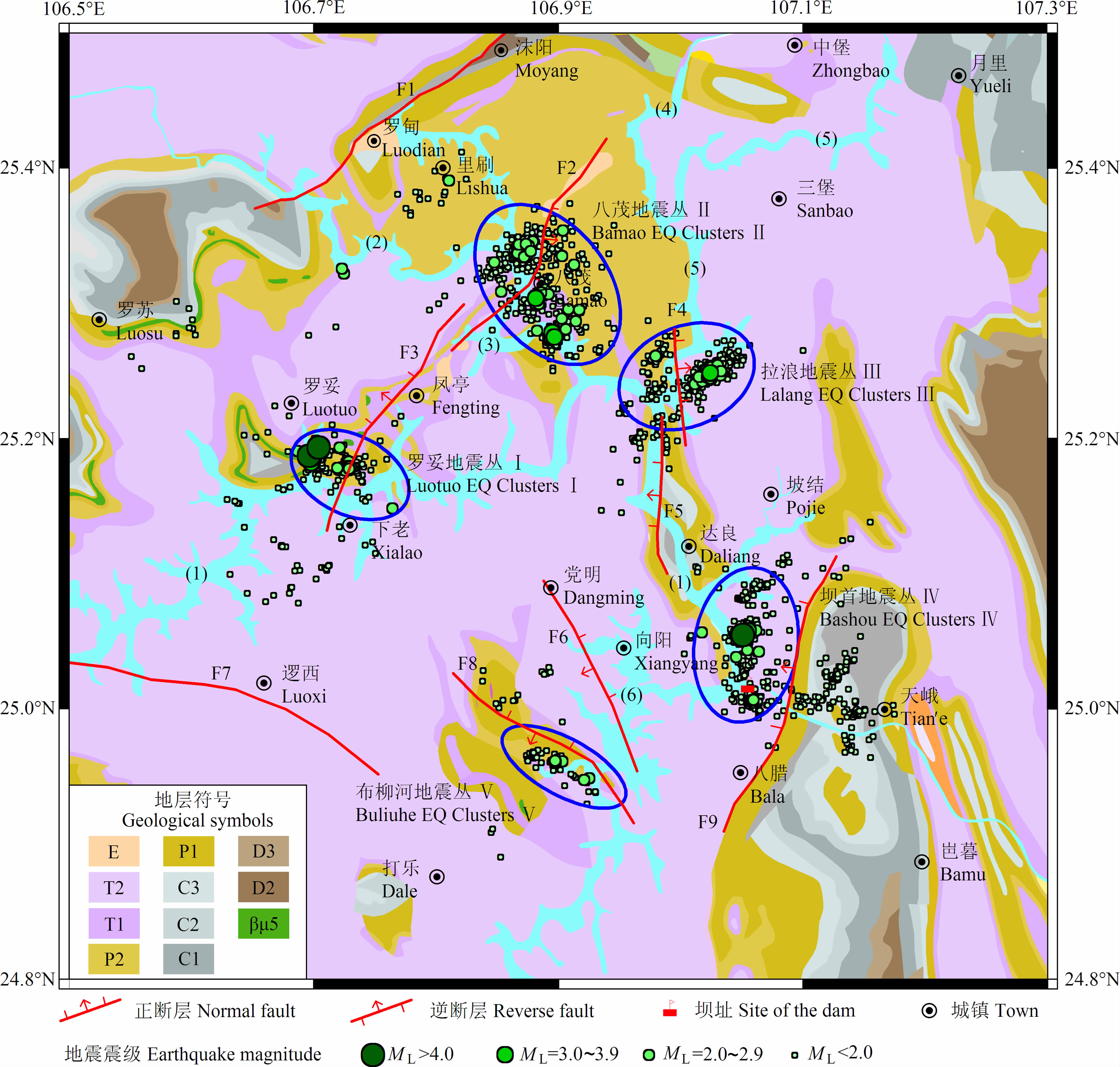 据历史记载,自公元19世纪到1969年,龙滩库区共发生MS3.0级以上地震7次,最大为1875年6月8日乐业6 1/ 2级地震,此次地震震中距坝址约56 km(史水平等,2009).自1970年有仪器记录地震以来至2002年,区域发生的地震基本上分布在库区外围,其中1983年乐业县马庄乡发生了一次震群活动,最大地震为MS4.6级.2003年至2005年期间发生的地震主要集中在大坝周围,由于龙滩水库于2003年开始截流施工,推测这些地震很可能是大坝建设工程施工放炮或大坝建设过程导致的,由于当时水库周围没有地震台站,这种推测需要更多的调查来证实(陈翰林等,2009).2006年9月30日龙滩水库开始蓄水,伴随着水位的快速上升,库区开始出现频繁的小震活动,截至2013年5月26日,共记录ML0.0级以上地震3682次,其中,ML1.0~1.9级837次,ML2.0~2.9级128次,ML3.0~3.9级8次,ML4.0~4.9级3次,分别是2007年3月7日罗妥ML4.0级、2007年7月17日天峨ML4.5级和2010年9月18日罗妥ML4.8级地震.我们利用龙滩水库数字遥测地震台网(包括12个固定地震台站和1个中继站)的记录波形数据,采用双差法与波形互相关技术,对2006年9月30日至2013年5月26日库区发生的地震进行了精确定位,共获得精定位地震3074个,占地震总数83.5%.从精定位结果来看,水平向最大误差为76.6 m,垂直向最大误差为88.8 m,明显优于台网定位结果.图 1是根据精定位结果绘制的库区地震震中分布图,可以看出,龙滩水库蓄水后地震活动呈现出明显的丛集性,主要分布在罗妥(丛Ⅰ)、八茂(丛Ⅱ)、拉浪(丛Ⅲ)、坝首(丛Ⅳ)和布柳河(丛Ⅴ)5个水库蓄水后淹没的深水区.其中:地震丛Ⅰ分布于红水河流域罗妥至下老一带,F3断裂沿NNE向穿过该丛,地震优势走向NW,库区蓄水以来发生的3次ML4.0级以上地震中有两次位于该丛,最大为2010年9月18日ML4.8级地震,也是水库蓄水以来迄今为止最大的地震;地震丛Ⅱ分布于F2断裂与油拉河交汇处的八茂附近,呈NW向优势展布,小震众多,最大为2008年6月20日ML3.2级和2010年10月7日ML3.2级地震;地震丛Ⅲ分布于拉中—纳沙一带,F4断裂穿过该丛,并被蓄水后的牛河水域所淹没,该丛地震呈NEE向优势展布,小震也比较多,最大为2010年1月25日ML3.0级地震;地震丛Ⅳ分布于拉当—坡结一带,靠近F9断裂及龙滩大坝,距坝址最近,最大地震为2007年7月17日ML4.5级地震,自蓄水开始,该带地震一直非常活跃,地震分布走向与F9断裂走向一致;地震丛Ⅴ分布于大坝以南布柳河河面较为宽阔的纳宜西岸,F8断裂与布柳河交汇处附近,1983年12月5日乐业县马庄乡ML4.8级地震以北,该丛地震分布与F8断裂的走向吻合,无论频度还是强度均为5个地震丛中最弱的一丛,最大为2007年6月21日ML2.8级地震(图 1).