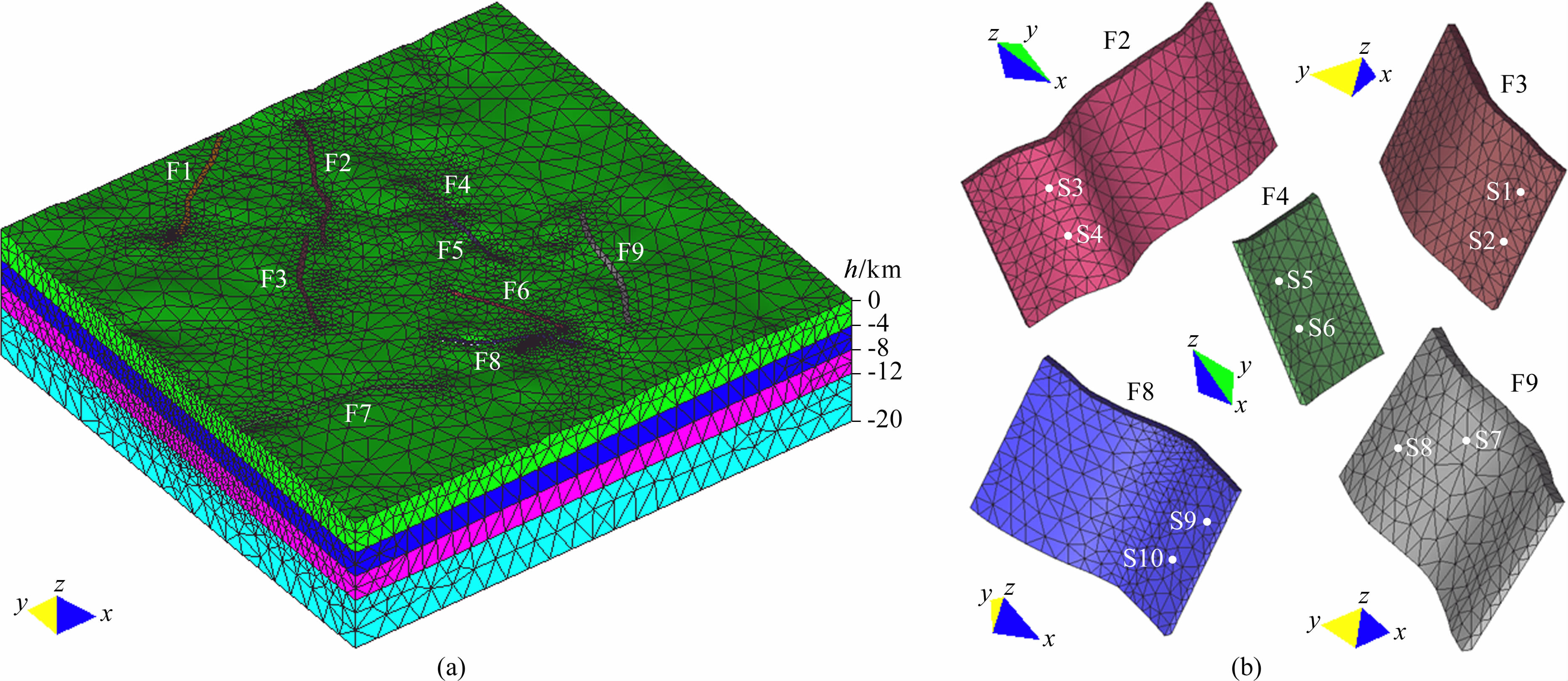 ![]() | 图 2 龙滩水库三维有限元模型及不同断层上设置的观察点 (a)龙滩水库三维有限元模型;(b)不同断层上设置的观察点.F1:罗甸—望谟断裂;F2:高圩—八茂断裂;F3:凤亭—下老断裂;F4:马耳—拉浪断裂; F5:达恒—达良断裂; F6:党明—桂花断裂;F7:望谟—逻西断裂;F8:长里—八南断裂;F9:龙凤—八腊断裂;S1-S10为不同断层上设置的观察点. Fig. 2 The three-dimensional finite element model of Longtan Reservoir and observation points in different faults F1: Luodian-Wangmo Fault; F2: Gaoxu-Bamao Fault; F3: Fengting-Xialao Fault; F4: Ma′er-Lalang Fault; F5: Daheng-Daliang Fault; F6: Dangming-Guihua Fault; F7: Wangmo-Luoxi Fault; F8: Changli-Banan Fault; F9: Longfeng-Bala Fault; S1-S10 expresses different observation points in different faults. |