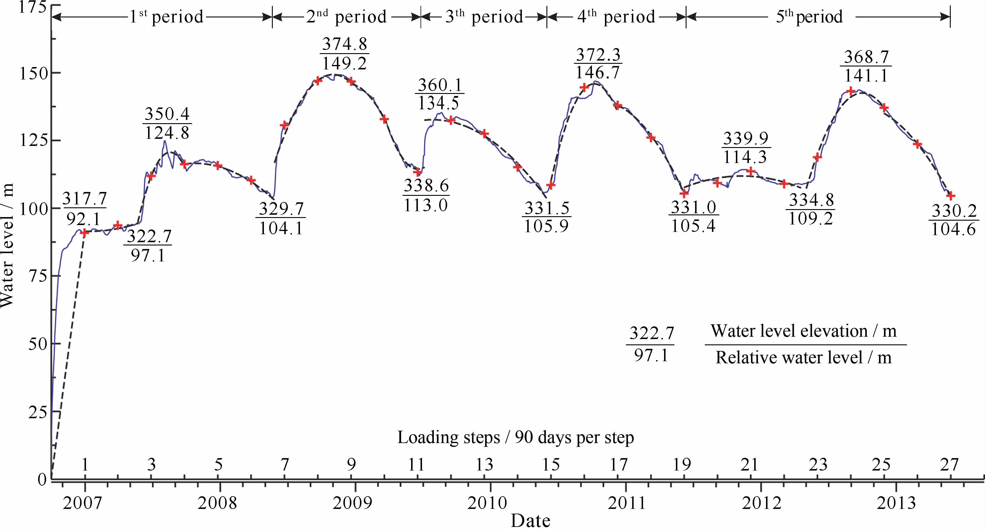 边界条件的设定为:模型底边界、侧边界固定法向位移,切向可自由滑动;上表面为自由表面,在水库蓄水时,各蓄水单元正应力为每一时间步长水体重力产生的压应力.孔隙压力场初始条件假定处于水饱和且静水压力平衡状态,侧边界和底边界为渗流封闭边界.依据2006年9月30日—2013年5月26日期间龙滩水库坝前水位变化资料,将相对于2006年9月30日基准水位(海拔高度约225.6 m)的水位变化用分段直线或二次多项式加载函数在库体处施加动水头边界和动荷载边界(图 3),计算时共设置了27个计算步,每步历时90天.