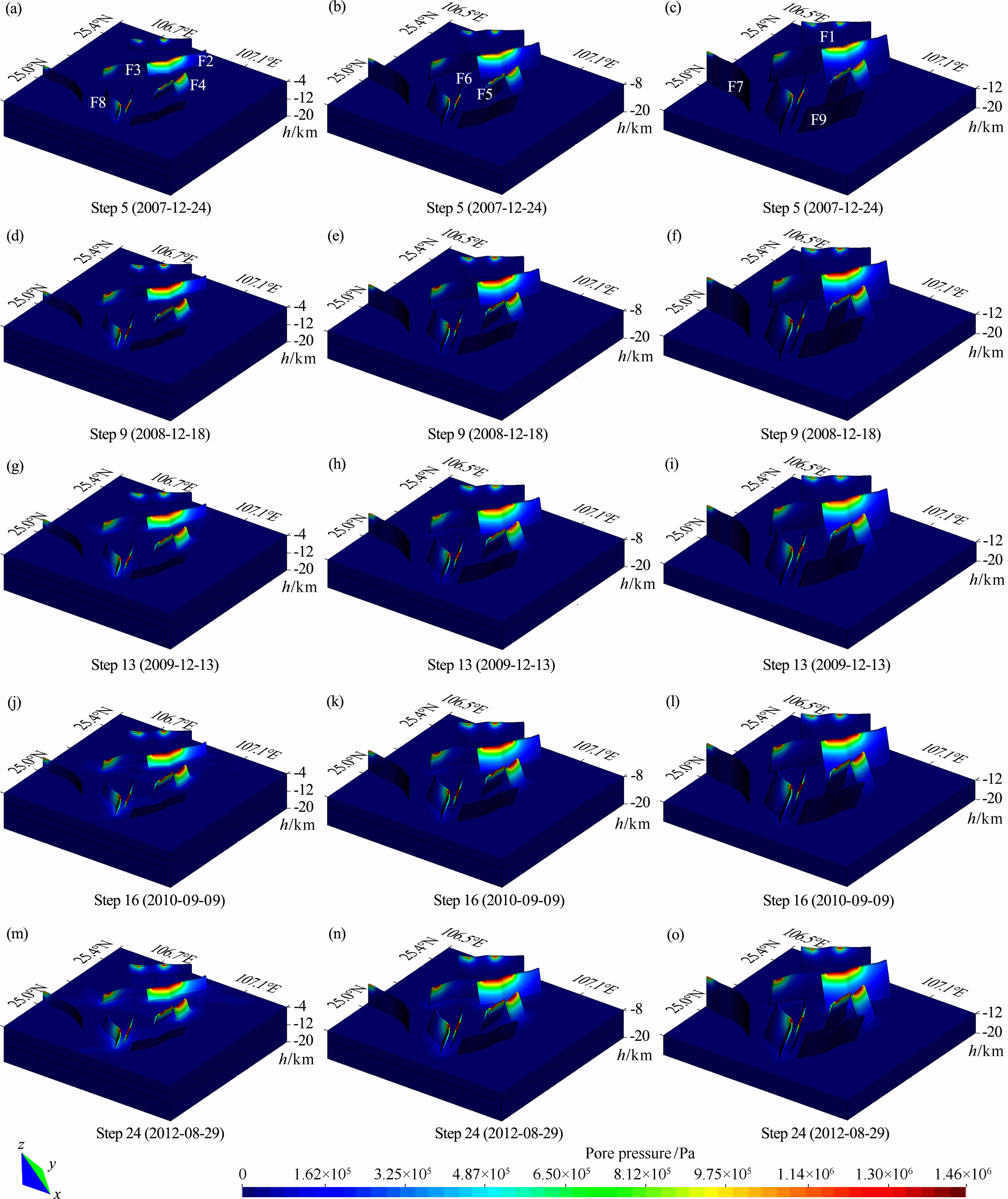 ![]() | 图 4 5个典型计算时步地表水体附加水头压力向深部扩散的云图 (a)、(d)、(g)、(j)、(m)分别为海拔-4 km平面及其以上断层面在5个典型计算时步的孔隙压力响应;(b)、(e)、(h)、(k)、(n)分别为海拔-8 km平面及其以上断层面在5个典型计算时步的孔隙压力响应;(c)、(f)、(i)、(l)、(o)分别为海拔-12 km平面及其以上断层面在5个典型计算时步的孔隙压力响应. Fig. 4 Cloud picture of the additional surface water head pressure diffusion to the deep in 5 typical calculation time steps (a)、(d)、(g)、(j)、(m)respectively expresses the pore pressures response in horizontal plane of -4 km level and in fault planes above that level during 5 typical calculation time steps;(b)、(e)、(h)、(k)、(n)respectively expresses the pore pressures response in horizontal plane of -8 km level and in fault planes above that level during 5 typical calculation time steps;(c)、(f)、(i)、(l)、(o)respectively expresses the pore pressures response in horizontal plane of -12 km level and in fault planes above that level during 5 typical calculation time steps. |