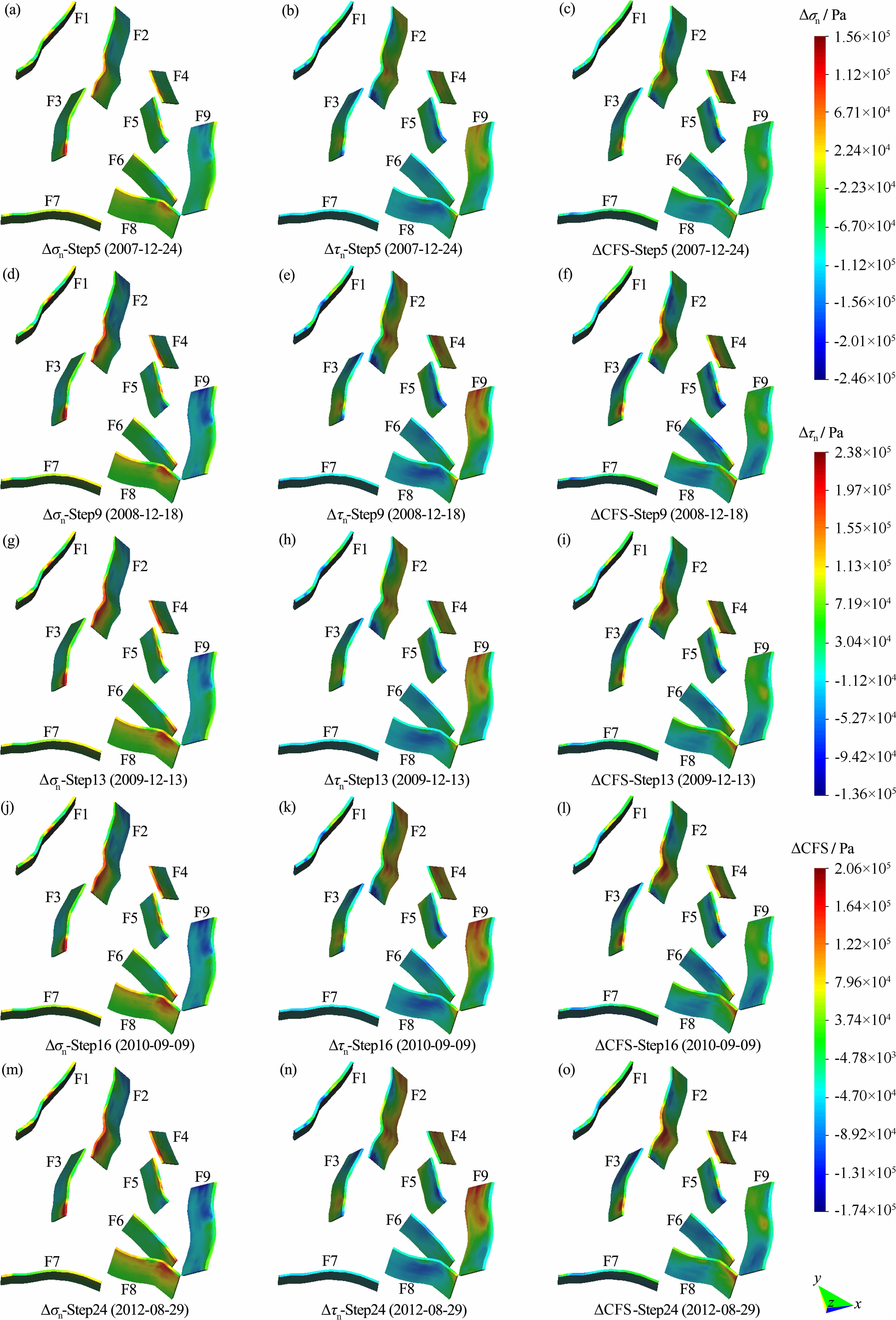 ![]() | 图 5 5个典型计算时步有效附加正应力(左列)、剪应力(中间列)和库伦应力(右列)变化云图 Fig. 5 Cloud picture of the effective additional normal stress(left column),shear stress(middle column) and Coulomb failure stress(right column)in 5 typical calculation time steps |