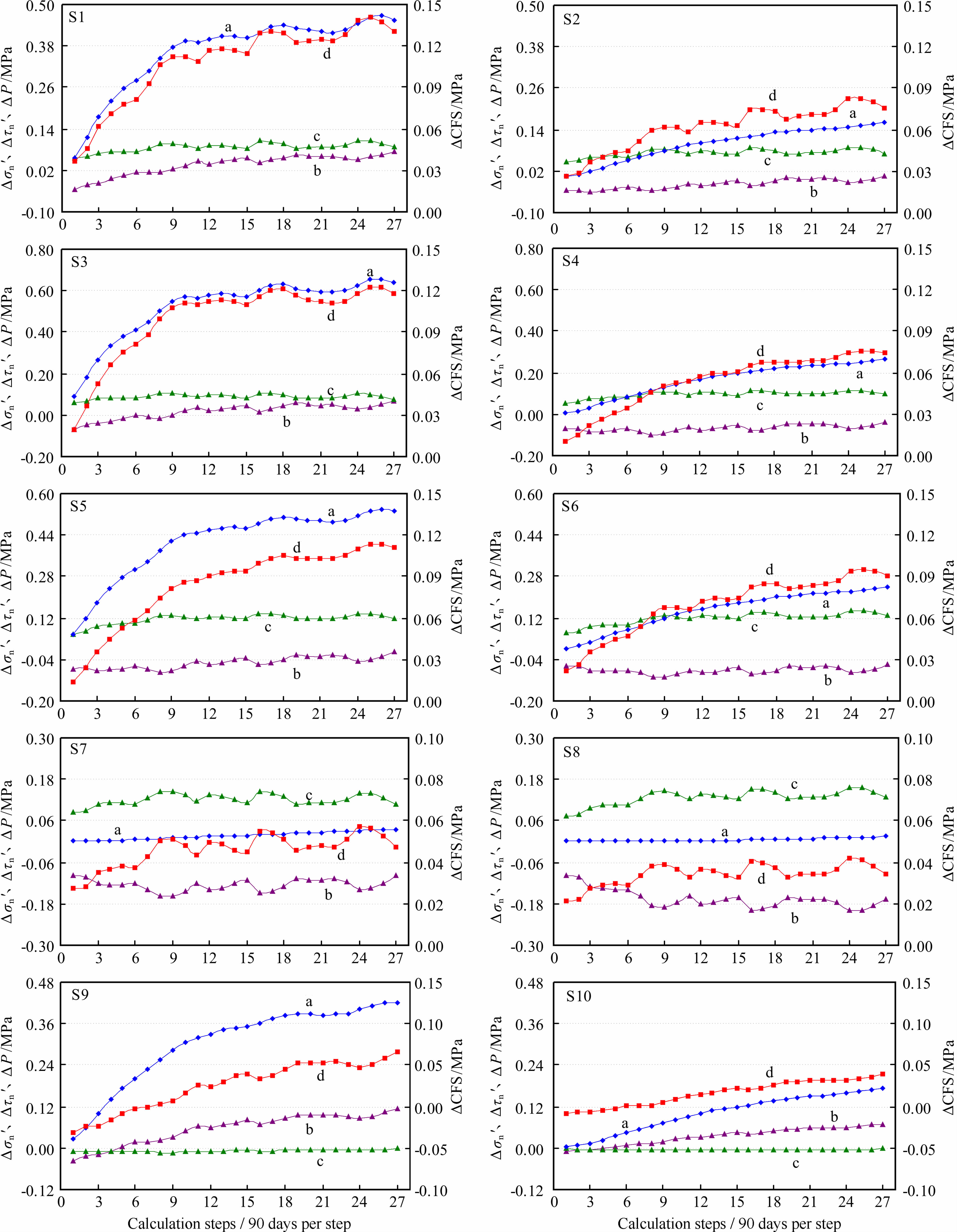 图 6d为不同观察点库伦应力的时序变化曲线,可以看出:(1)ΔCFS变化受观察点处库体重力荷载作用强弱及孔隙压力响应大小的控制,并与断裂的运动性质有关.F2、F3、F4断裂的孔隙压力响应水平较高,且具有正倾滑运动的分量,无论是库体重力荷载作用还是地表水体附加水头压力扩散作用,均有利于ΔCFS的增加,故分布于这些断裂上的观察点(S1—S6)均表现出ΔCFS总体变化趋势与孔隙压力响应一致,局部起伏变化形态与Δτ′ n同向同步的特点;F8断裂的孔隙压力响应水平也比较高,但是具有逆倾滑运动的分量,单纯库体重力荷载会抑制断裂的错动,故S9、S10观察点ΔCFS总体变化趋势与孔隙压力响应一致,局部起伏变化形态与Δτ′ n同步反向;F9断裂以正倾滑运动为主,孔隙压力响应微弱,ΔCFS主要受库体荷载作用的控制,S7、S8观察点仅表现出与Δτ′ n同向同步起伏变化的形态.(2)位于连通库底且渗透性较好的F2、F3、F4、F8断裂上的观察点,ΔCFS变化趋势与孔隙压力响应曲线相似,具有“先快后慢”的特点.这些断裂浅部的S1、S3、S5、S9观察点,在水库蓄水初期ΔCFS上 升快,大致在蓄水后900天(第10个计算时步)ΔCFS 分别达到0.113、0.111、0.086和0.021 MPa,此后升速明显变缓;断裂深部观察点的ΔCFS在蓄水1710天(第19个计算时步)之前的时段升速较快,分别达 到0.068、0.067、0.080和0.029 MPa,之后逐渐变缓.