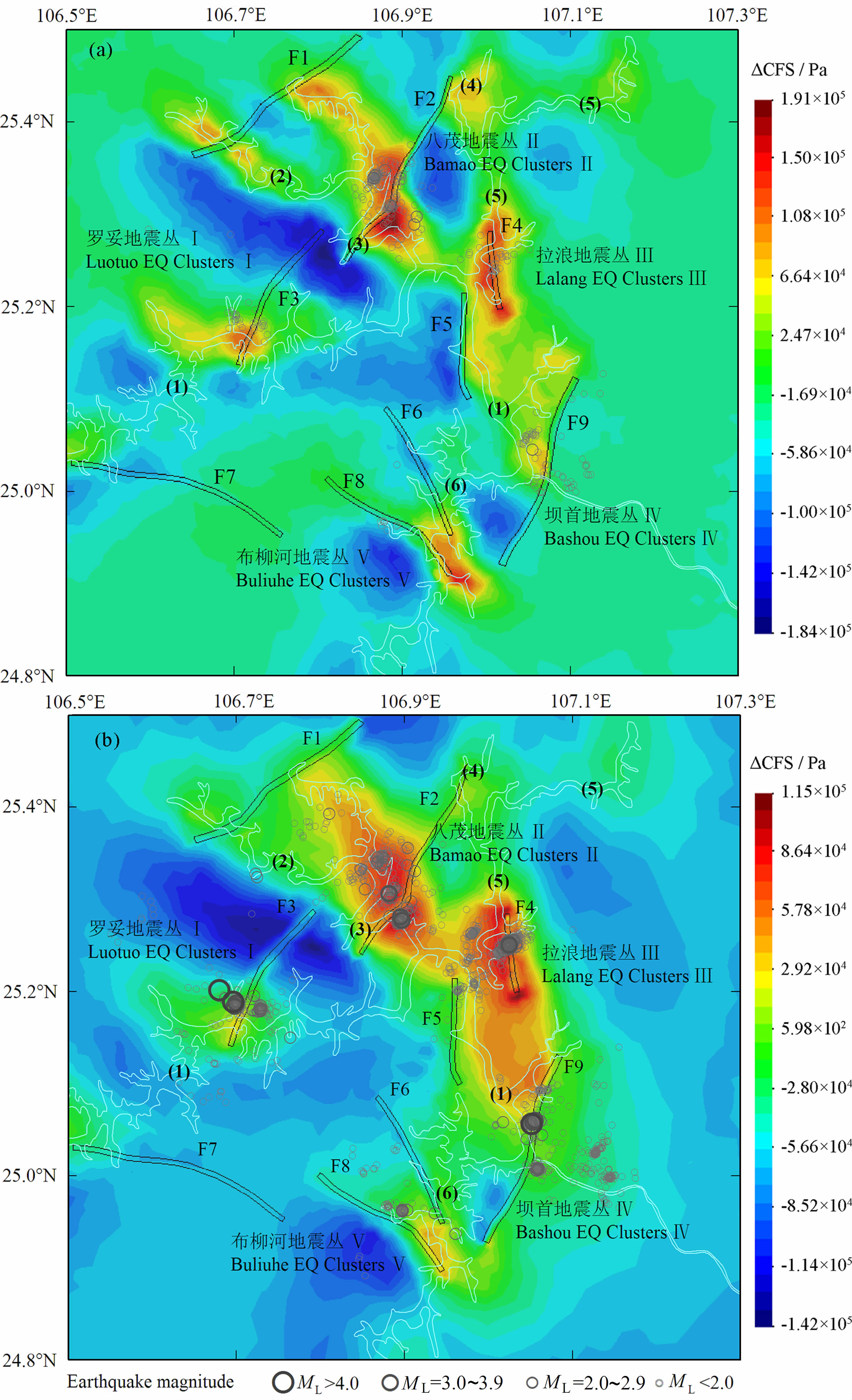 由数值模拟结果可知,F2断裂中段与油拉河交汇、F3断裂南端与红水河交汇、F4断裂与红水河和牛河交汇、F6和F8断裂与布柳河交汇的断裂段及F9断裂中北段,是龙滩水库蓄水后ΔCFS增加最明显的断裂段(图 6).通过与图 1的对比不难发现,这些断裂段恰恰是水库蓄水后地震活动最为密集分布的部位,而ΔCFS的影区和增幅较小的断裂或断裂段几乎没有地震发生,这表明库区地震活动与水库加卸载及渗透过程中库底断层稳定性的变化密切相关.前期研究表明,RIS的发生不仅与库底先存断裂等大型结构面有关,而且还受控于断裂与围岩的组合形式,以及围岩体中裂隙发育程度、岩性变化等反映的岩体力学性质与渗透性能不均匀性(周斌,2010).龙滩水库蓄水后,围岩体的稳定性到底发生了怎样的变化?这种变化又与地震活动之间存在何种关系呢?由于目前尚难对库区地下岩体中裂隙、节理、劈理、层理等低级别结构面的几何参数做出准确的统计,本文设定一种比较理想的模型进行计算.我们对龙滩库区中、小地震震源机制的求解结果和陈翰林等(2009)的研究结果均显示,现今龙滩库区整体上处于以剪切为主的构造应力环境中,主压应力以NWW-SEE向为主,可以假设在现今构造应力环境中,库底岩体中处处存在着走向230°、倾角80°、滑动角-165°的次级结构面.图 7a是第24个计算时步(水库蓄水后第2160天)海拔-3 km水平面累积ΔCFS变化的图像,图 7b是该计算时步海拔-7 km水平面的累积ΔCFS变化图像;同时,我们 把水库蓄水2160天之前震源深度小于等于5 km和大于5 km的地震分别投影到图 7a和图 7b中.可以看出,无论浅部还是深部,F2断裂中段与油拉河交汇、F3断裂南端与红水河交汇、F4断裂与红水河和牛河交汇、F6和F8断裂与布柳河交汇的断裂段附近的岩体中,以及F9断裂中北段位于断层上盘的岩体中,ΔCFS增加显著,如果库底同一深度岩体的初始应力积累水平大致相同的话,无疑这些ΔCFS增加显著的岩体中的次级结构面就更易破裂失稳.从库区浅部和深部(以地下5 km为界限)地震发生的实况来看,水库蓄水后围岩体(次级结构面)ΔCFS显著增加的区域也恰恰是地震活动最密集的区域,这就进一步印证了水库蓄水后ΔCFS变化在诱发库区地震活动方面发挥了重要的作用.