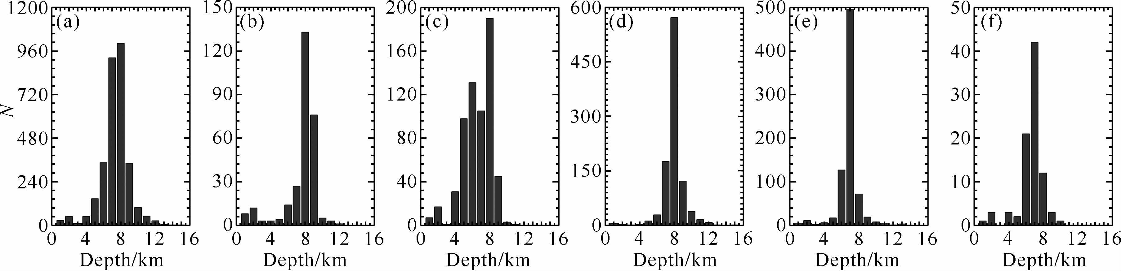 ![]() | 图 8 龙滩水库蓄水后库区地震震源深度分布图 (a)全部地震;(b)地震丛Ⅰ;(c)地震丛Ⅱ;(d)地震丛Ⅲ;(e)地震丛Ⅳ;(f)地震丛Ⅴ. Fig. 8 Focal depth distribution map of earthquakes taken place after water storage in the Longtan Reservoir areas (a)Total earthquakes;(b)Earthquake clusters Ⅰ;(c)Earthquake clusters Ⅱ;(d)Earthquake clusters Ⅲ; (e)Earthquake clusters Ⅳ;(f)Earthquake clusters Ⅴ. |