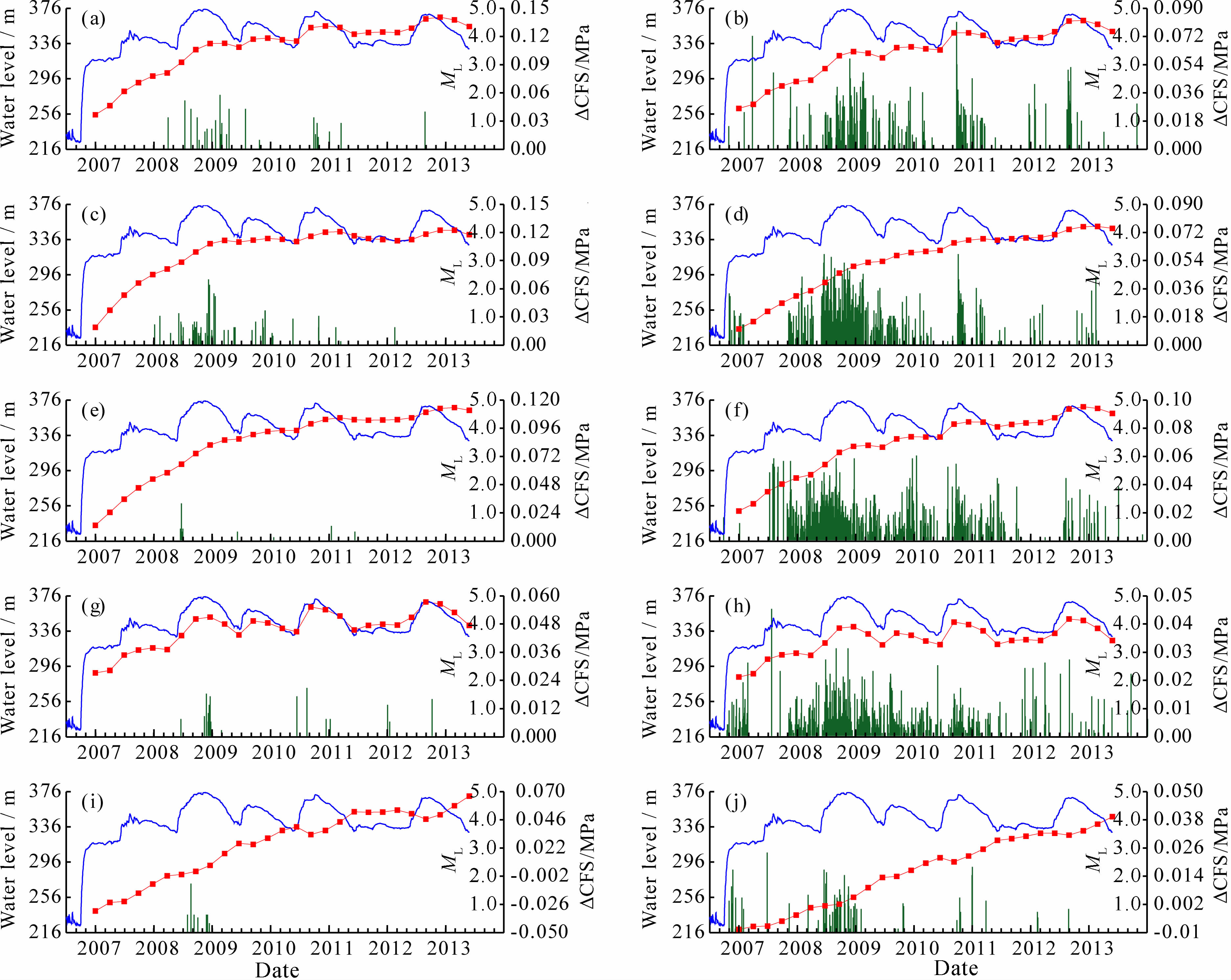 ![]() | 图 9 各地震丛集区深、浅部地震M-T图与对应观测点库伦应力变化曲线 蓝色线为相对于2006年9月30日基准水位(海拔高度约225.6 m)的坝前水位变化;红色线为ΔCFS变化;墨绿色线为M-T图中的地震震级;(a)、(c)、(e)、(g)、(i)分别为地震丛Ⅰ、Ⅱ、Ⅲ、Ⅳ、Ⅴ中震源深度小于等于5 km地震的M-T图及与之对应S1、S3、S5、S7、S9观测点的ΔCFS时序变化曲线;(b)、(d)、(f)、(h)、(j)分别为地震丛Ⅰ、Ⅱ、Ⅲ、Ⅳ、Ⅴ中震源深度大于5 km地震的M-T图及与之对应S2、S4、S6、S8、S10观测点的ΔCFS时序变化曲线. Fig. 9 M-T diagram of the earthquakes respectively taken place in each earthquake cluster and respectively distributed in deep and shallow stratums, and the sequential variation curve of coulomb stress in the corresponding observation point The blue line expresses water level changes in front of the dam compared with the baseline level(altitude 225.6 m)in September 30,2006; The red line expresses sequential variation of ΔCFS; The blackish green line expresses earthquake magnitude in M-T diagram;(a),(c),(e),(g),(i)respectively includes M-T diagram of the earthquakes taken place in the Earthquake cluster Ⅰ,Ⅱ,Ⅲ,Ⅳ,Ⅴ and focal depths less than or equal to 5 km, and also respectively includes sequential variation of ΔCFS in the corresponding observation point S1,S3,S5,S7,S9;(b),(d),(f),(h),(j)respectively includes M-T diagram of the earthquakes taken place in the Earthquake cluster Ⅰ,Ⅱ,Ⅲ,Ⅳ,Ⅴ and focal depths more than 5 km, and also respectively includes sequential variation of ΔCFS in the corresponding observation point S2,S4,S6,S8,S10. |