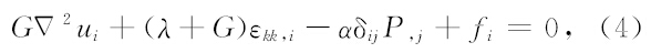 基于连续介质力学理论和多孔介质有效应力定律,当忽略惯性力作用时,岩石骨架变形平衡方程可用位移的形式表示为(Bell and Nur, 1978; Biot, 1941,1956,1972)