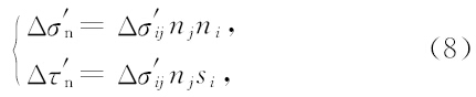 由发震断层的空间几何参数和滑动方向(走向φ、倾角δ和滑动角λ),可求出断层面法向单位矢量ni(i=1,2,3)和滑移方向单位矢量si(i=1,2,3).若受水库地表水体荷载作用和附加水头压力扩散作用的影响,水库蓄水后比蓄水前有效应力张量变化了Δσ′ ij,则Δσ′ ij在断层面法向上的投影分量Δσ′ n和滑动方向上的投影分量Δτ′ n分别为