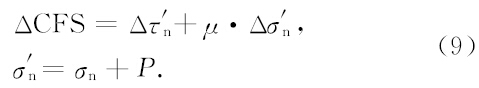 经张量计算可以求出水库蓄、放水造成断层上库伦应力的变化量ΔCFS(Okada,1992;Harris and Simpson, 1992; 石耀霖和曹建玲,2010),其表达式为