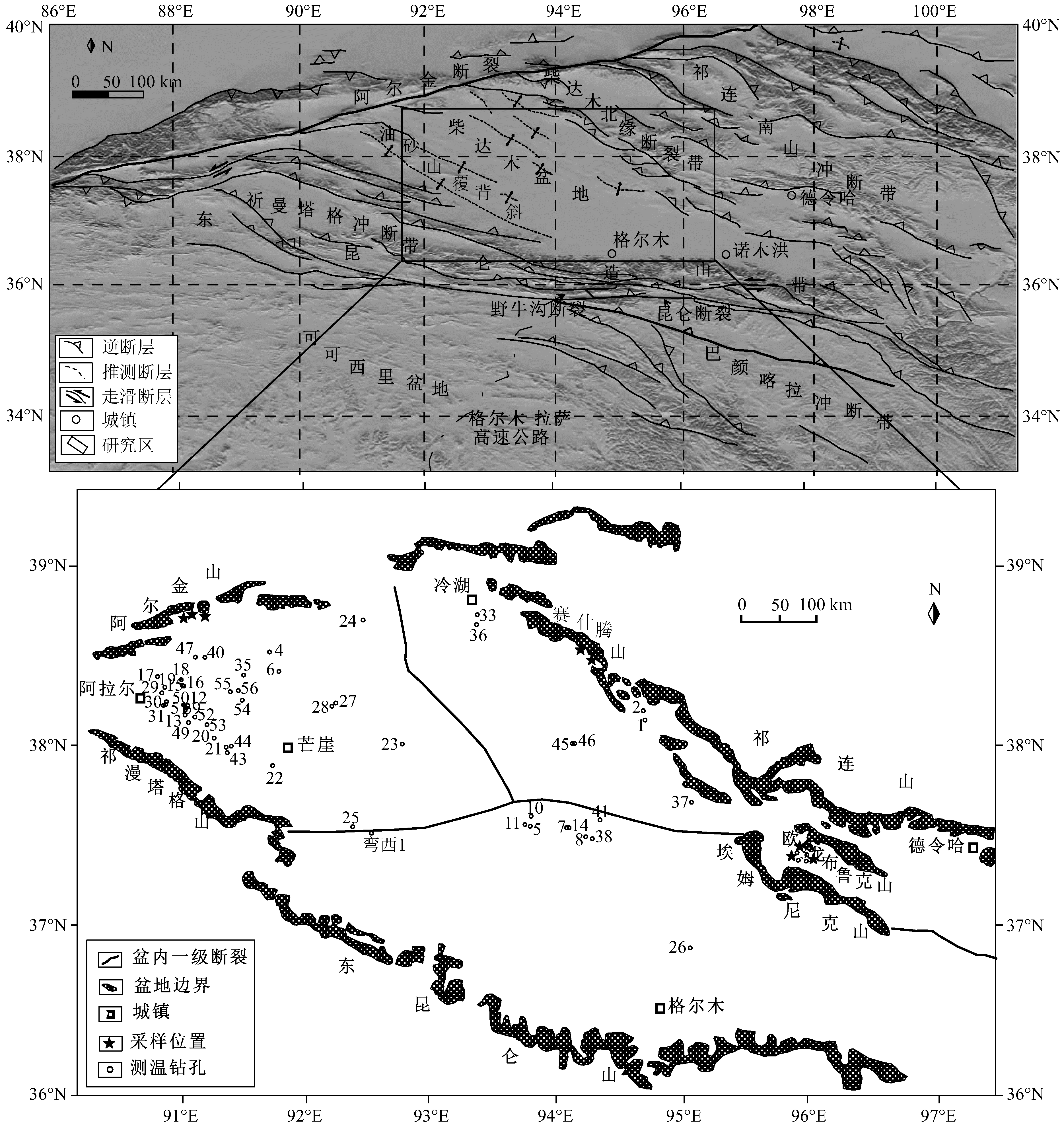 ![]() | 图 1 柴达木盆地构造位置与测温钻孔分布图(据Yin等(2008)修改)Fig. 1 The tectonic setting of the Qaidam basin and distribution of the wells (Modified from Yin et al.(2008)) |