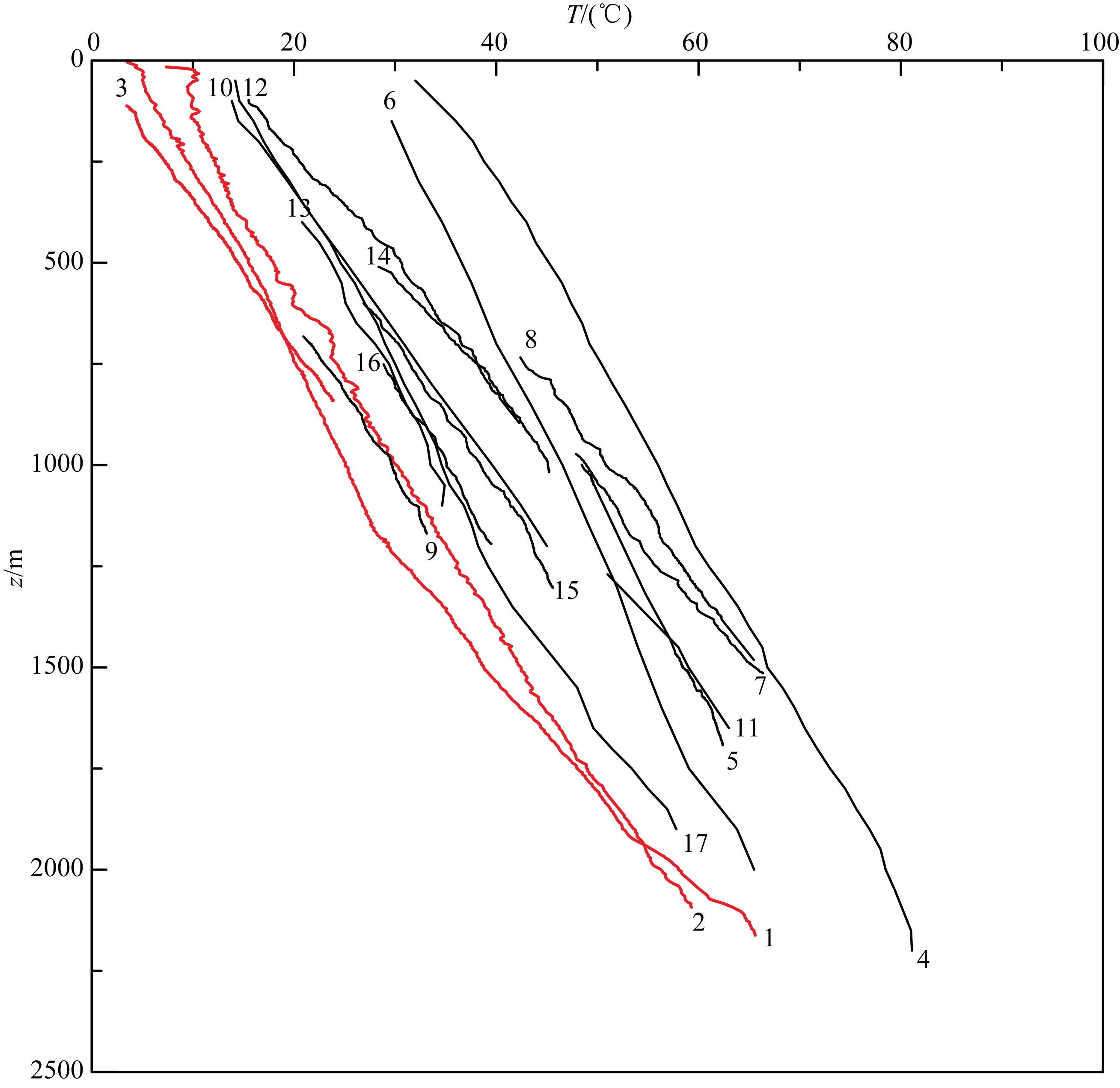 ![]() | 图 2 柴达木盆地新增测温钻孔温度-深度曲线1—柴页1(Chaiye1); 2—龙5(long5); 3—柴页2(Chaiye2); 4—建西1(Jianxi1); 5—台南4(Tainan4); 6—建参1(Jiancan1); 7—涩19(Se19); 8—涩21 (Se21); 9—沙中151 (Shazhong151); 10—台南3 (Tainan3); 11—台南5 (Tainan5); 12—沙中30 (Shazhong30); 13—沙中100 (Shazhong100); 14—涩22 (Se22); 15—花14 (Hua14); 16—花20 (Hua20);17—七26 (Qi26) . 其中,编号1—3(红色曲线)为稳态测温数据;编号4—17(黑色曲线)为整理分析后的静井测温曲线.Fig. 2 The change of geo-temperature with depth in the 17 boreholes of Qaidam basin |