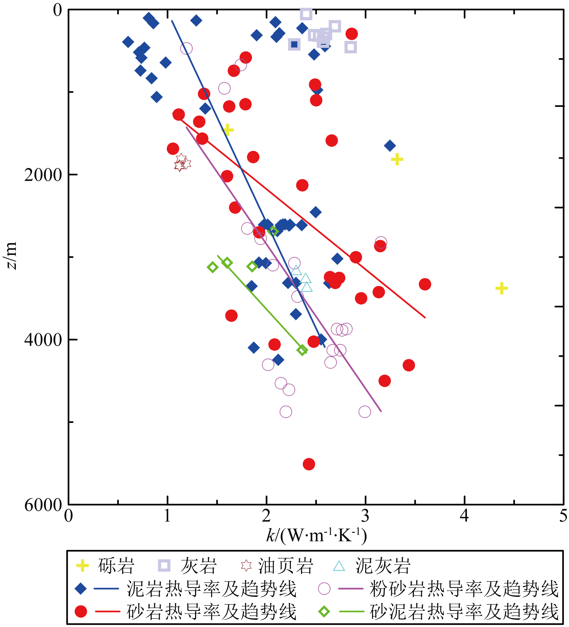 研究发现热导率的值与砂泥含量比成正相关. 统计数据显示砂质泥岩热导率的平均值与随深度变化的斜率均比泥岩大,砂岩热导率的平均值与随深度变化的斜率均比粉砂岩大(图 5),从泥岩、砂质泥岩、泥质粉砂岩、砂岩的过渡中,热导率值随砂泥比增加相应变大.