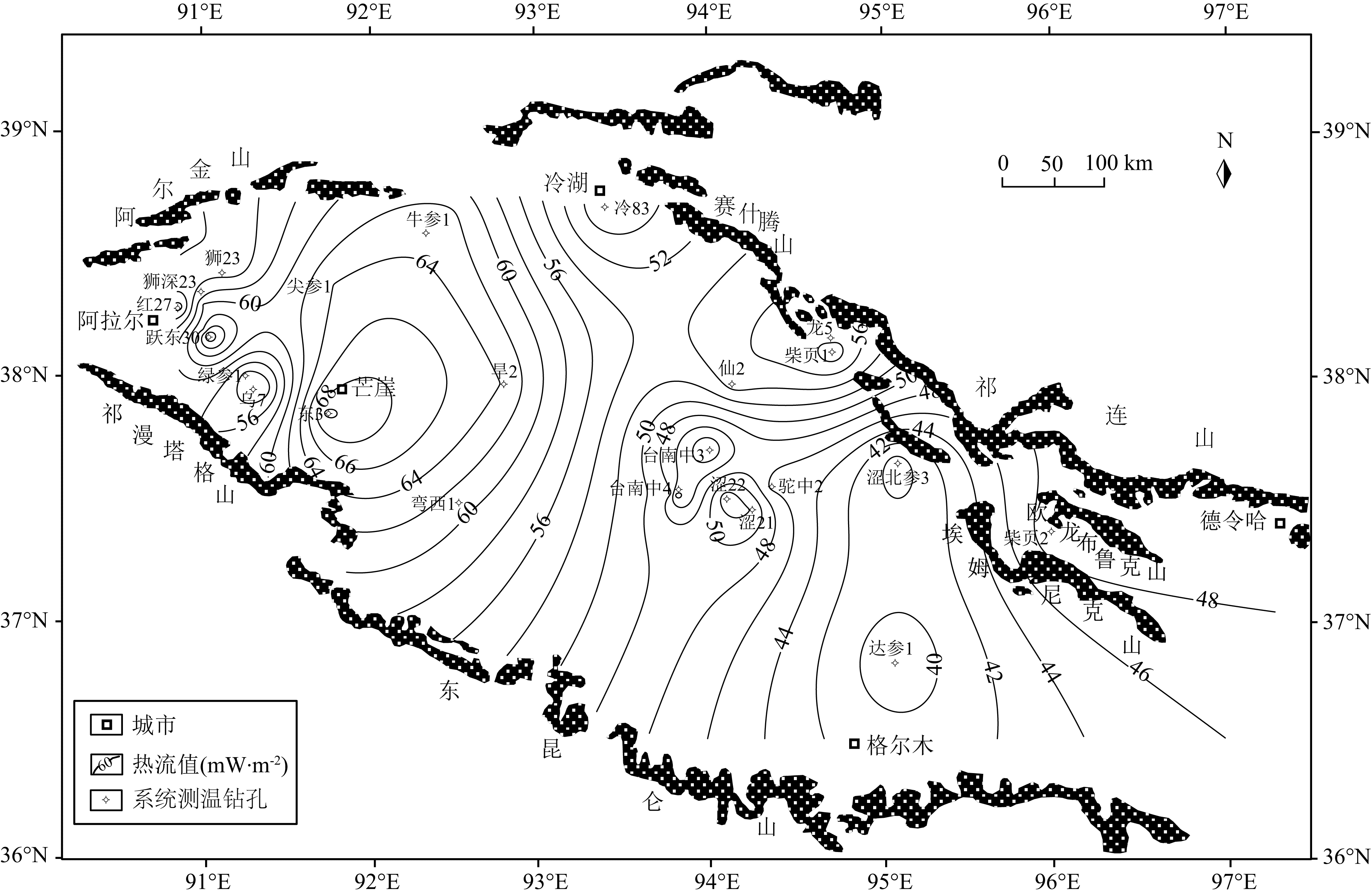 ![]() | 图 6 柴达木盆地现今热流分布图Fig. 6 Distribution pattern of present-day heat flow in Qaidam basin |