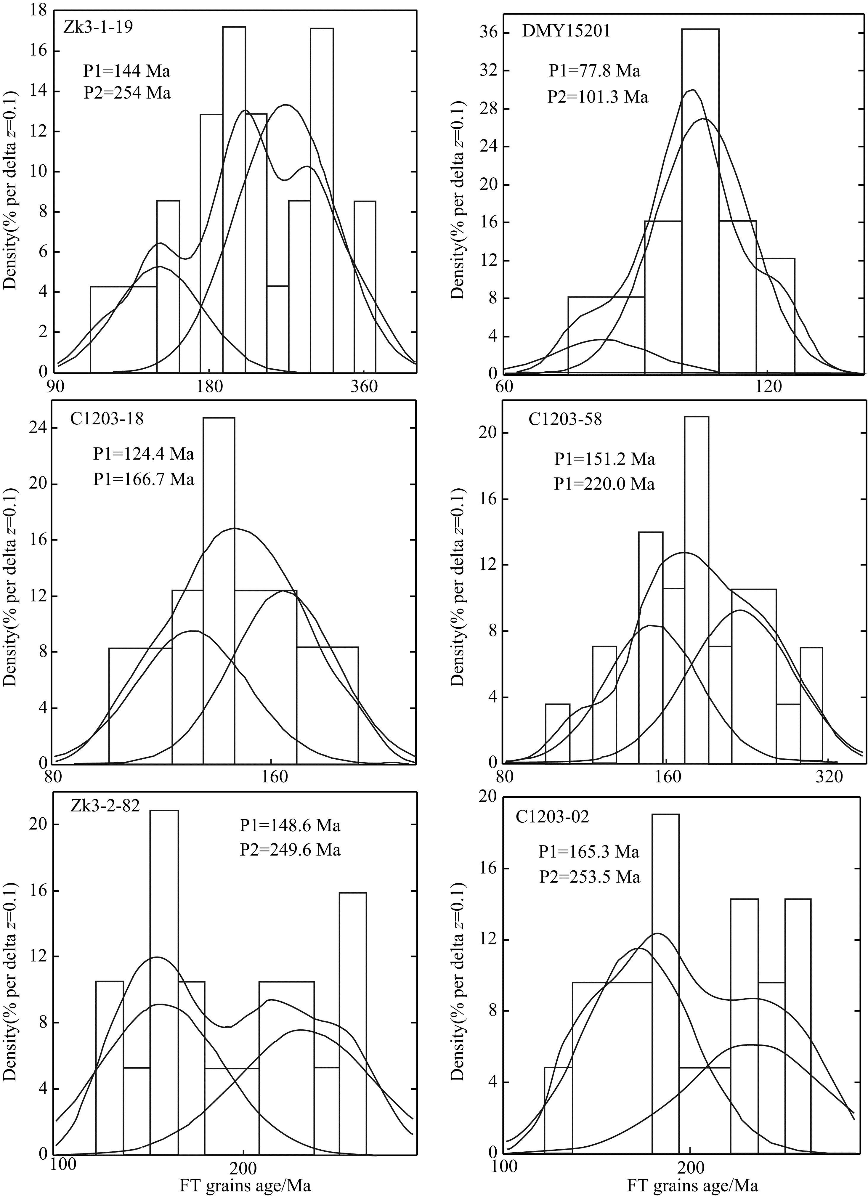 ![]() | 图 7 锆石裂变径迹年龄组分龄概率分布图Fig. 7 Probability density plots with best fit for the peak values of the zircon fission track age |