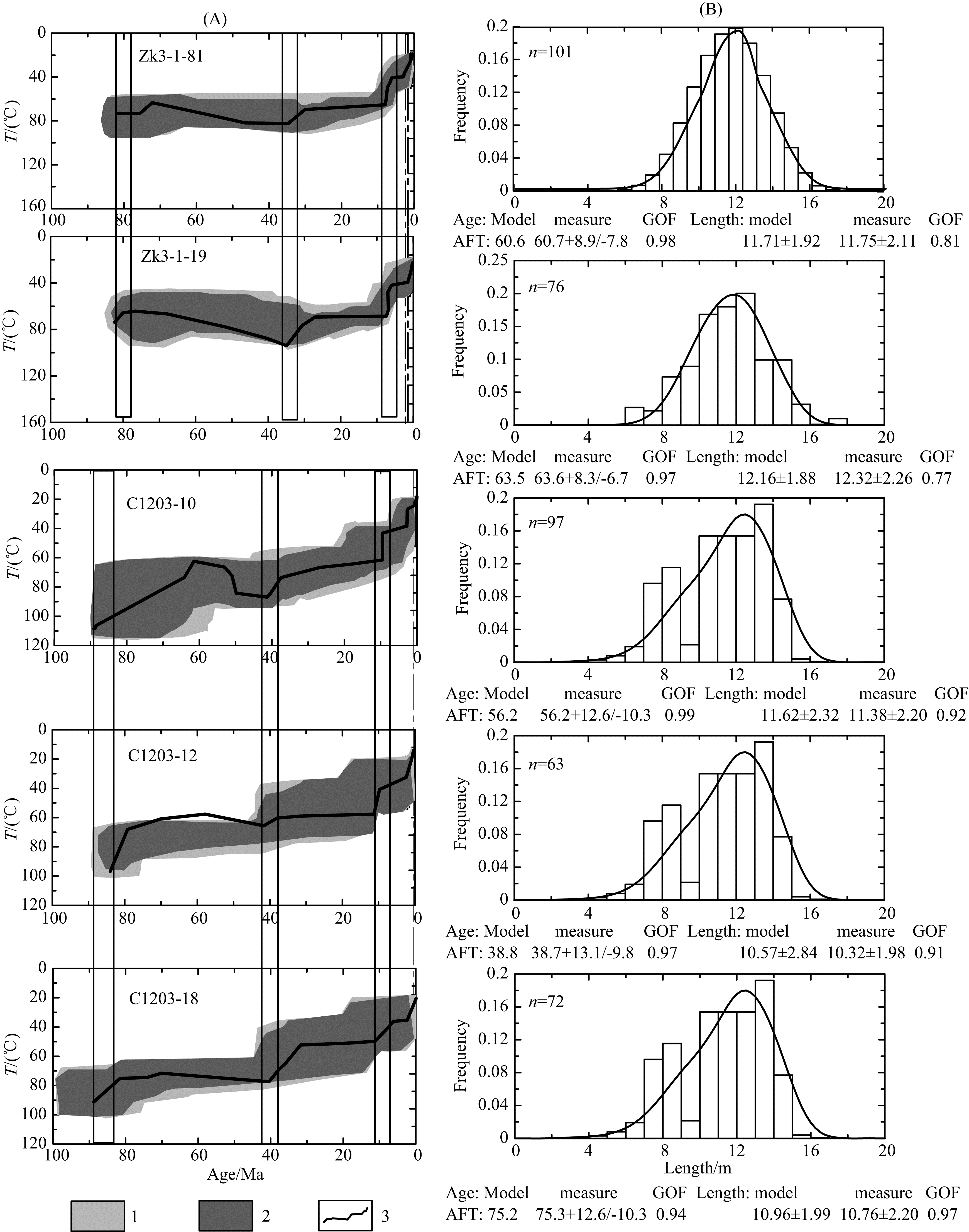 4.3 测试结果磷灰石裂变径迹年龄与长度测试结果见表 3. 柴东上石炭统克鲁克组三个样品(Zk3-1-19,Zk3-1-74,Zk3-1-81),AFT年龄集中在61—72 Ma,小于其 相应的地层年龄;平均封闭径迹长度为11.8~12.7 μm,小于初始径迹长度(16.3±0.9 μm),呈单峰态分 布,显然这三件样品经历了中度退火行为,最高温度超过120 ℃. 柴北缘联合沟上奥陶统滩间山群的4个AFT样品(C1203-10,C1203-12,C1203-18,C1203-39),AFT年龄集中在39—58 Ma,远 小于其相应的地层年龄,平均封闭径迹长度为10.3~11.4 μm,小于初始径迹长度(16.3±0.9 μm),C1203-12,C1203-18呈似双峰态分布. 磷灰石裂变径迹年龄的χ均大于或远远大于5%,表明所分析样品的单颗粒年龄差异属于统计误差,并且样品的磷灰石裂变径迹年龄为单一的年龄,没有多组年龄现象(Galbraith,1984).