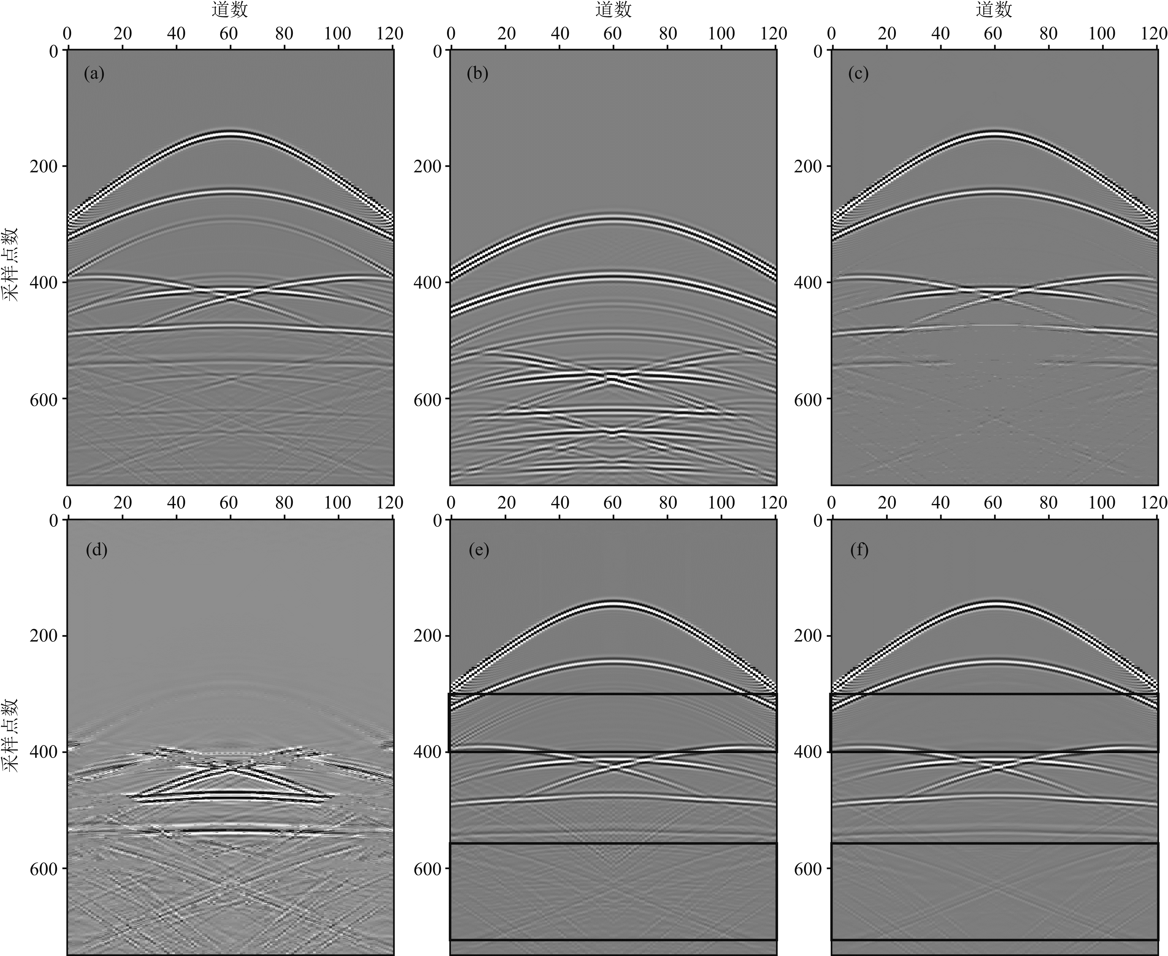 首先选取洼陷模型正演产生的炮记录.图 5a为原始单炮记录,图 5b为预测得到的多次波模型.应用屏蔽滤波器首先保存大部分一次波能量,如图 5c所示.再将剩余的波场作为输入的原始波场,与多次波模型进行一次简单的L2模的匹配相减处理,主要目的是使输入的原始数据与模型数据在振幅量级上相匹配;再利用复曲波变换进行剩余一次波和多次波分离,本文是直接对一次波模型进行动力学校正(原始波场减去多次波模型后的波场作为模型数据输入);振幅校正因子的范围选取的是从0.5到1.5,相位误差的校正范围为±3 ms,校正分离后的剩余一次波波场如图 5d所示,将图 5c和图 5d相加,得到分离后的一次波波场,图 5f所示.与伪多道匹配方法(图 5e)相比较可以看出,基于复曲波变换的一次波分离方法能够很好地将一次波和多次波分离,同时能够保持一次波基本不受损害,而伪多道的方法仍存在较明显的多次波残余.