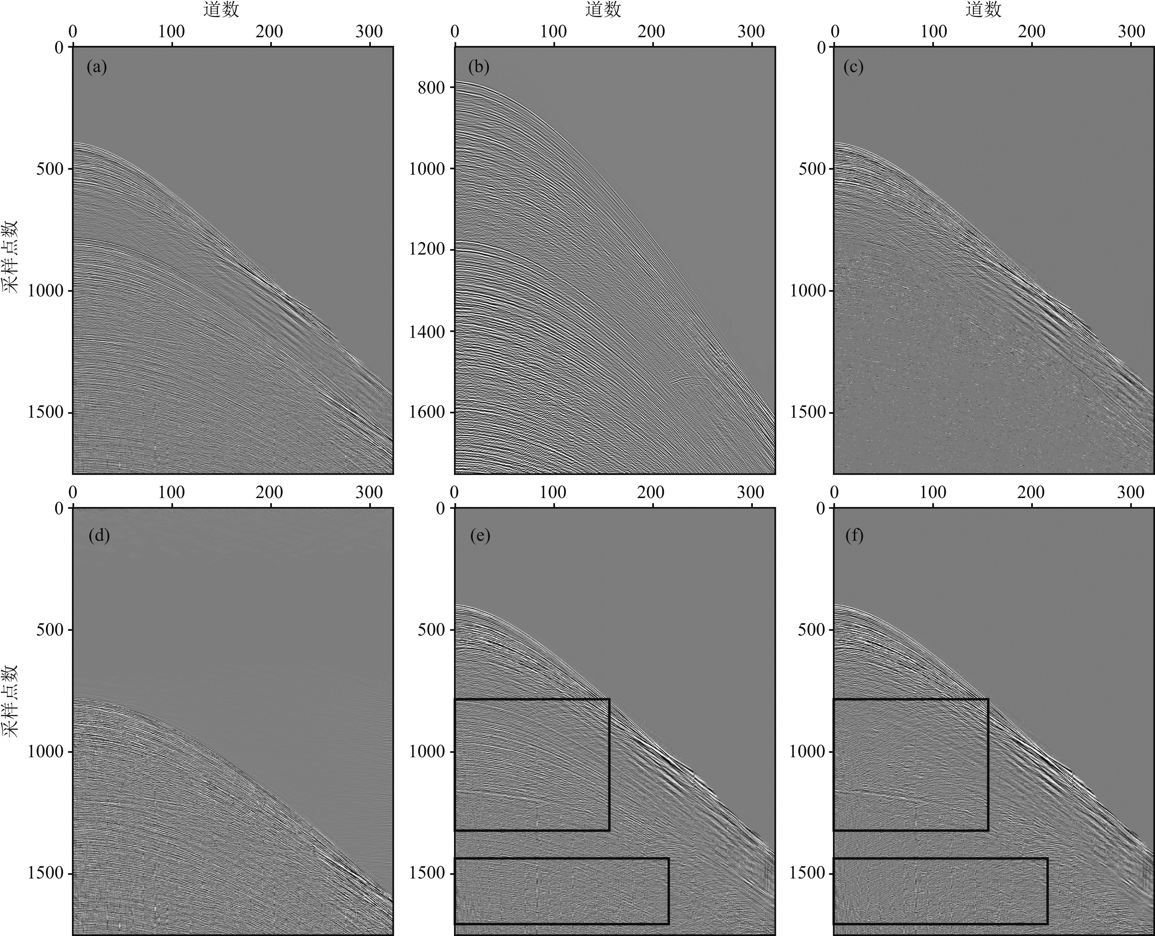 ![]() | 图 5 洼陷模型数据一次波恢复对比图(a) 原始炮记录; (b) 输入的多次波模型; (c) 应用屏蔽滤波器获得的一次波; (d) 基于复曲波变换分离的剩余一次波; (e) 伪多道方法获得的一次波; (f) 基于复曲波变换最终获得的一次波.Fig. 5 Contrast diagrams of primary recovery of sunken model data(a) Original shot gather; (b) Multiple model; (c) Preserved primary; (d) Residual primary obtained by CCT-based separation method; (e) Primary obtained by pseudo multi-channel matching method; (f) Primary obtained by CCT-based separation method. |
