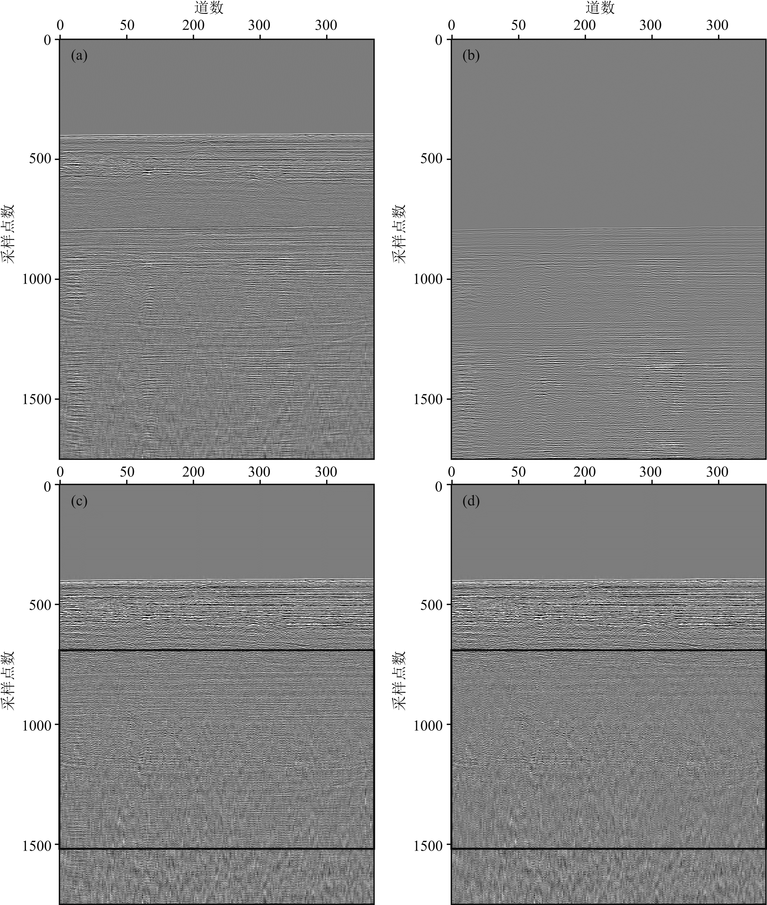 ![]() | 图 7 某海上数据共偏移距剖面对比图 (a) 原始近偏移距数据; (b) 多次波模型数据; (c) 伪多道方法获得的一次波数据; (d) 本文方法获得的一次波数据.Fig. 7 Contrast diagrams of common-offset section of ocean data(a) Original near-offset data; (b) Multiple model; (c) Primary obtained by pseudo multi-channel matching method; (d) Primary obtained by CCT-based separation method. |