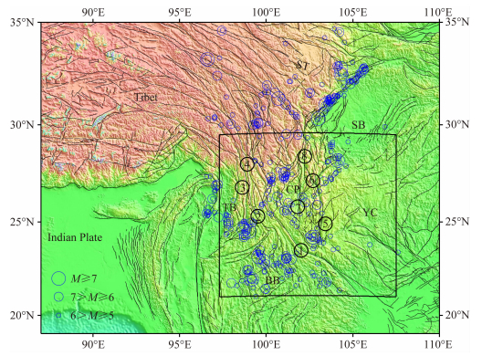 ![]() | 图 1 研究区位置及构造图(蔡麟孙等,2002;Liu et al.,2007) 图中黑色方框为研究区位置;蓝色圆圈为历史地震活动分布(数据来自:http://earthquake.usgs.gov/earthquakes/search/); ST:松潘—甘孜地体,SB:四川盆地,CP:川滇菱形块体,YC:扬子克拉通,TB:腾冲地块,BB:保山地块;①红河断裂,②澜沧江断裂,③怒江断裂,④金沙江断裂,⑤小江断裂,⑥则木河断裂,⑦绿汁江断裂,⑧安宁河断裂. Fig. 1 Study area and its tectonics The black rectangle indicates the study area. The blue circles suggest the epicenters of earthquakes occurred in this area (http://earthquake.usgs.gov/earthquakes/search/). ST: Songpan-Garzê terrane, SB: Sichuan basin, CP: Chuandian diamond block, YC: Yangtze craton, TB: Tengchong block, BB: Baoshan block. ① Red-river fault, ② Lancangjiang fault, ③ Nujiang fault, ④ Jinshajiang fault, ⑤ Xiaojiang fault, ⑥ Zemuhe fault,⑦ Lvzhijiang fault, ⑧ Anninghe fault. |