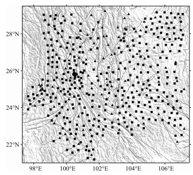 ![]() | 图 2 台站分布 正方形为流动观测台站,三角为固定观测台站. Fig. 2 The distribution of stations The squares denote the portable stations, and the triangles denote the permanent stations. |