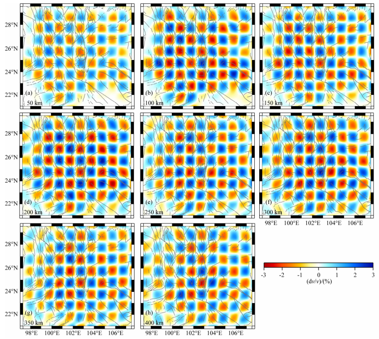 本次反演中模型的网格参数化采用等间隔的方式划分:水平方向网格大小0.5°×0.5°,垂直方向的深度间隔则为50 km.经过反复的检测板测试,我们发现在输入两倍于原本网格划分尺度的正负异常大小时,可以得到很好的恢复,这说明本次反演中能够分辨的异常体尺度为1°×1°×100 km.图 4为不同深度上的检测板测试结果,我们可以从图中明显的看到,在400 km深度内研究区大部分区域都具有较好的分辨能力,只是在50和100 km较浅的深度上受台站分布的影响,研究区的边缘地区分辨较差.通过检测板测试表明,本研究的反演结果分辨能力较高,具有一定的可信度.