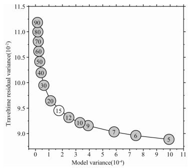本次层析成像反演计算采用的是带阻尼的LSQR算法(Paige et al.,1982),阻尼因子的选择影响着结果的可靠性.最佳的LSQR反演结果应同时使得模型方差和数据走时残差方差最小.反演计算时,选取不同的阻尼因子会让反演后的模型方差与数据走时残差方差呈现此消彼长的变化.那么,要得到最佳的反演结果,就要选取合适的阻尼因子,其选取往往通过模型方差和数据走时残差方差的折衷曲线来确定.图 5给出了本次反演的模型方差和数据走时残差方差的折衷曲线,根据该曲线,最后确定15是最为理想的阻尼因子.