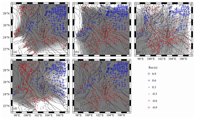![]() | 图 6 平均走时残差分布 蓝色十字表示正的走时残差,红色十字表示负的走时残差;灰线表示射线路径;(a)、(b)、(c)和(d)分别为地震分别于东北、东南、西南和西北方向时的平均走时残差分布;(e)为所有走时数据平均走时残差. Fig. 6 Distributions of the average traveltime residuals at every seismic station The blue and red crosses denote the early and delayed arrivals respectively. The gray lines denote the P-wave rays from the epicenters. (a), (b), (c) and (d) present the distributions of the average traveltime residuals from four different quadrants; (e) is the distributions of the all average traveltime residuals. |