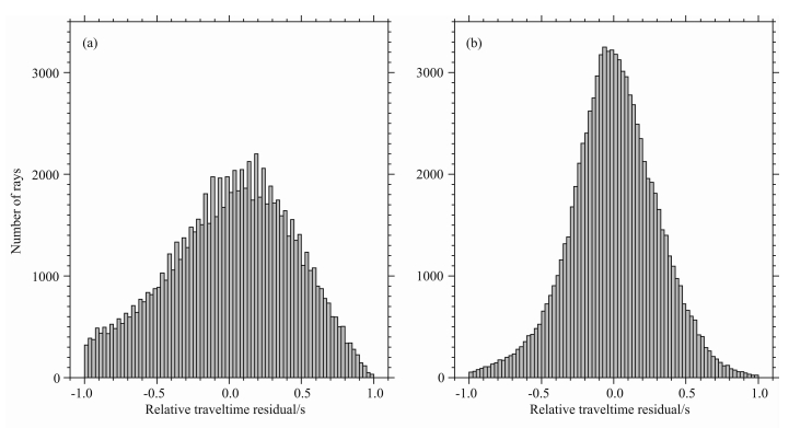 ![]() | 图 7 反演前(a)、后(b)走时残差统计 Fig. 7 The statistic of the traveltime residuals before (a) and after (b) inversion |