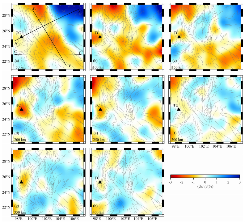 ![]() | 图 8 速度结构水平切片 (a)中AA′、BB′和CC′表示图9中三条剖面的位置;TC表示腾冲火山区位置. Fig. 8 Horizontal slices of the velocity structure Lines AA′, BB′ and CC′ indicate the locations of the vertical profiles shown in Fig.9. TC: Tengchong volcano. |