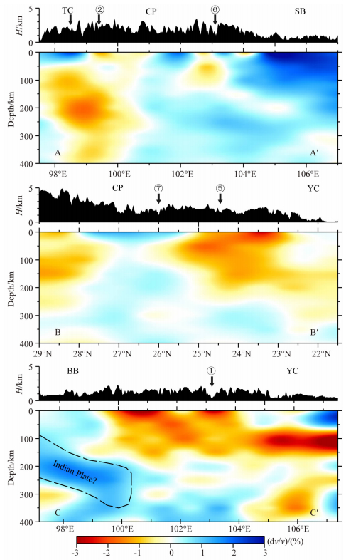 在图 9中,剖面AA′西起腾冲地块,经过腾冲火山地区,横跨川滇菱形块体后进入四川盆地,腾冲火山下方可见明显的低速异常,而四川盆地300 km深度以上为显著的高速异常;剖面BB′从川滇菱形块体北部的青藏高原东南部起经过小江断裂带,到达扬子克拉通南部地区,在该剖面中可见高原下方为低速异常,川滇菱形块体区域为高速异常,而从小江断裂带至扬子克拉通下方为低速异常;剖面CC′为沿着纬度23°的垂直剖面,它西部为保山地块,东部为扬子克拉通,该剖面中扬子克拉通下方100~150 km深度上分布着一条低速异常带,保山地块东部至红河断裂带下方150 km深度内为低速异常,保山地块下方存在一东向俯冲的高速异常带.